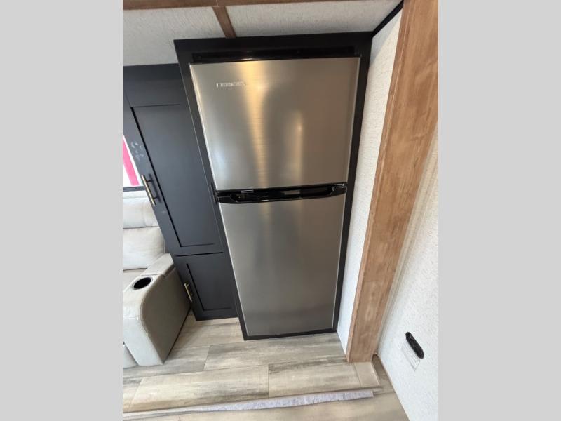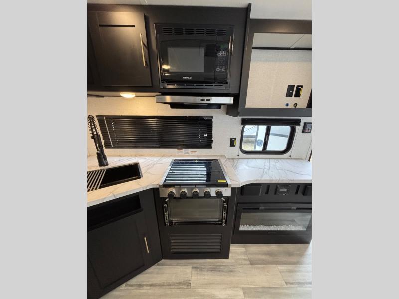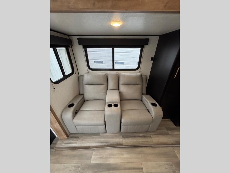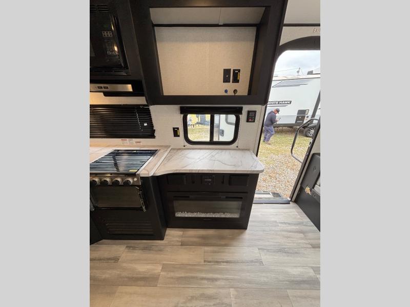 Load up and head to the lake in this cozy travel trailer. The large slide out will provide your crew with more space to stretch out, and the rear U-shaped dinette features a panoramic view to enjoy nature views. The kitchen includes a three burner gas stove with a 17" oven, plus a microwave oven and an 11 cu. ft. 12V Everchill refrigerator. You'll also find a theater seat across from the entertainment center and fireplace, and you can add the optional LED TV if you enjoy watching movies during camping trips. Head through the bath to enjoy your private bedroom with a queen bed, dual closets and nightstands, plus double shelves over the bed for your belongings.
