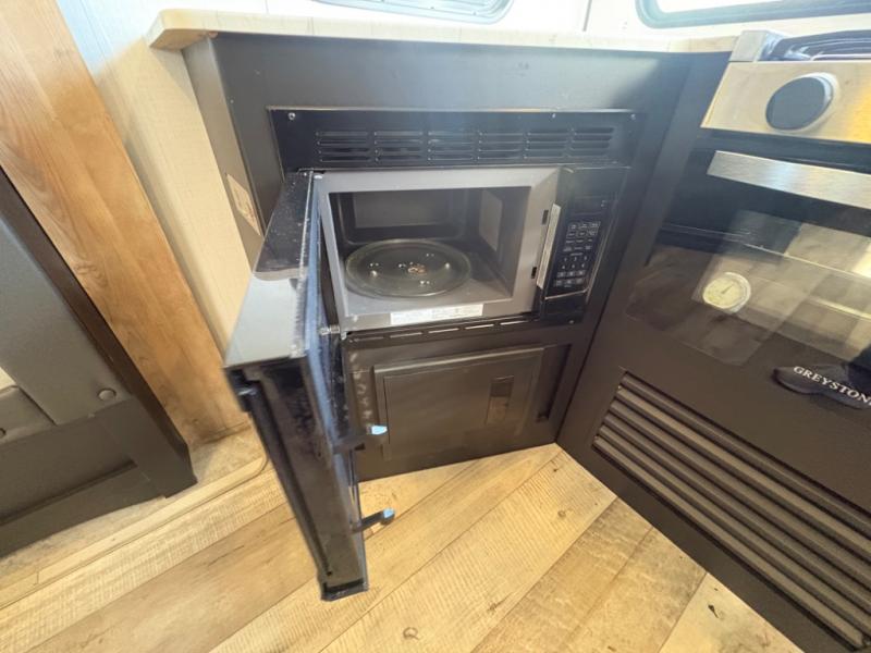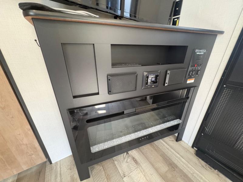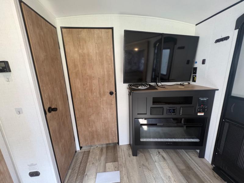 Enjoy all of your camping excursions in this rear kitchen, double slide unit that is perfect for 2-4 campers. The rear kitchen features nice countertop space, plus a great view out the panoramic window in back. Dual slides opposite each other creates an open concept feel in this combined kitchen/living area featuring comfortable theater seating, a large u-shaped dinette, plus a corner entertainment center and fireplace. There are also two pantries to hold all of your dry goods. The U-shaped dinette can easily be transformed into additional sleeping space for two. Up front, you will appreciate the private bedroom featuring a queen bed with dual closets, overhead cabinets and two shelves for your things. The walk-through bath is spacious as it is the entire width of the unit and provides a nice shower, toilet, sink and closet. Outside, enjoy the 12' awning that offers added living space and a front pass-through storage compartment will easily house all of your outdoor camping gear.