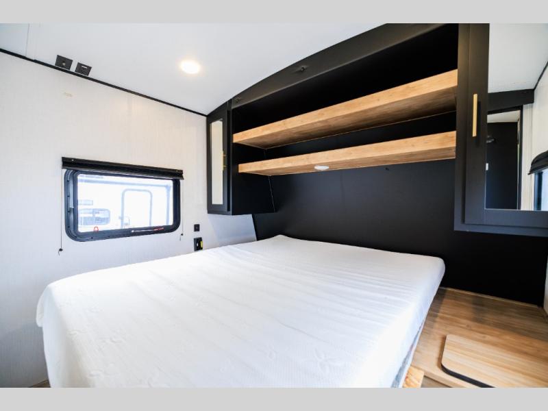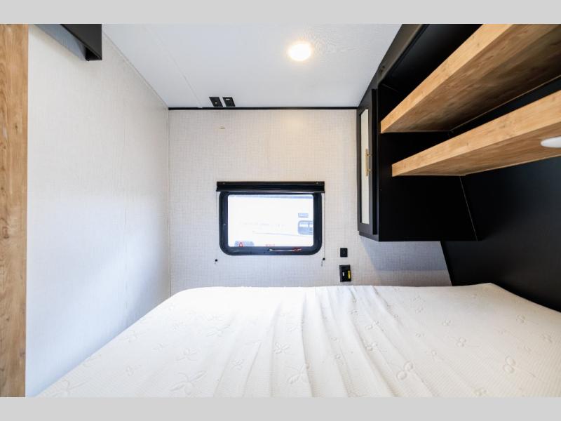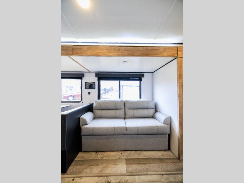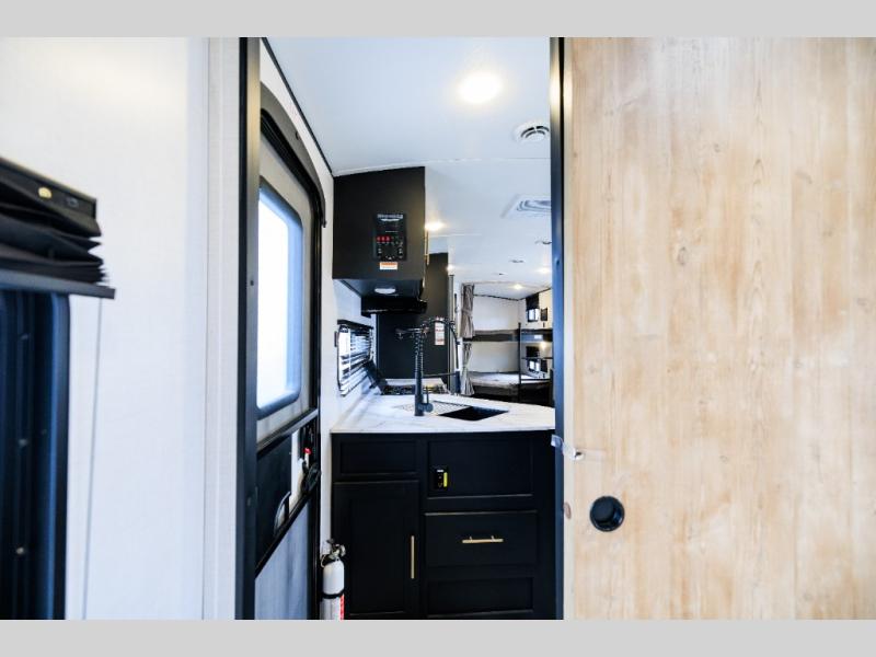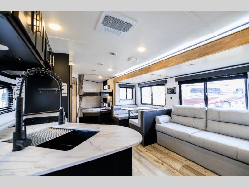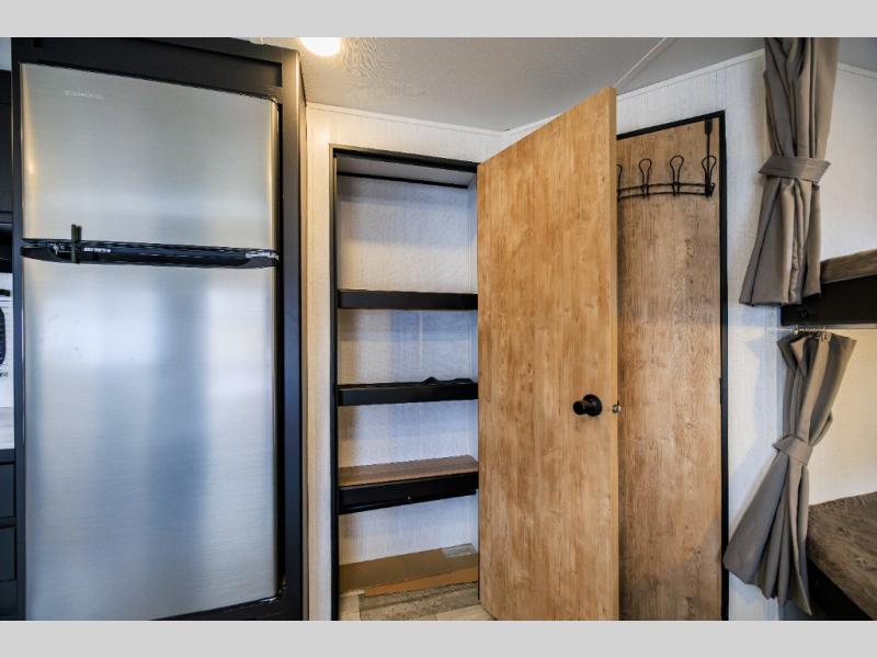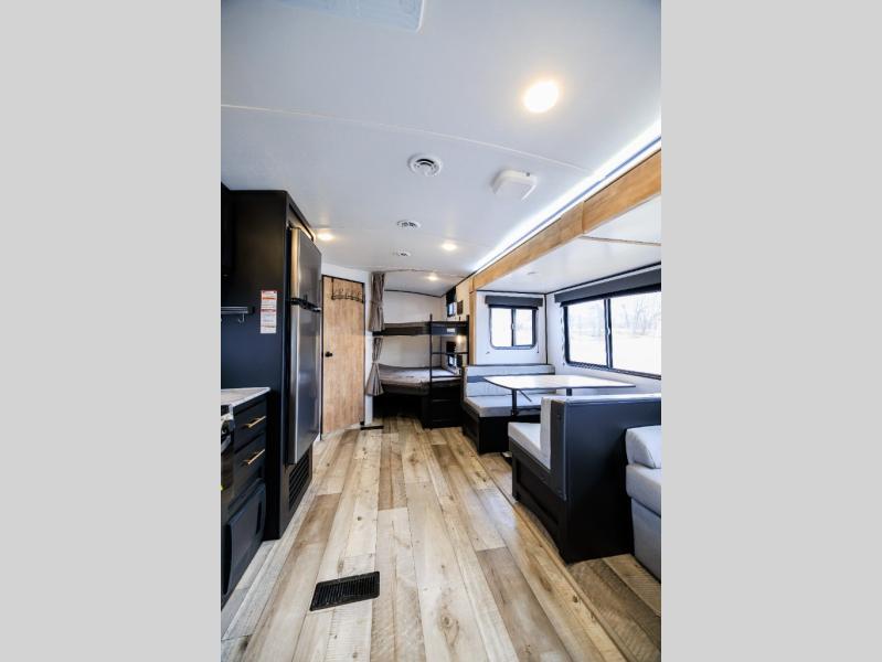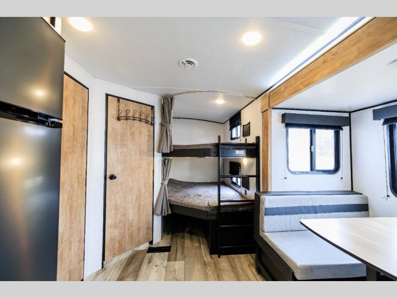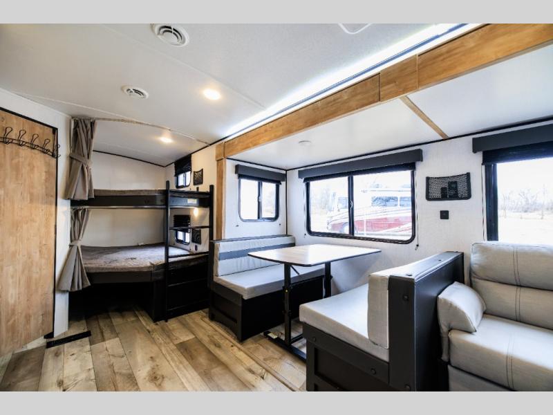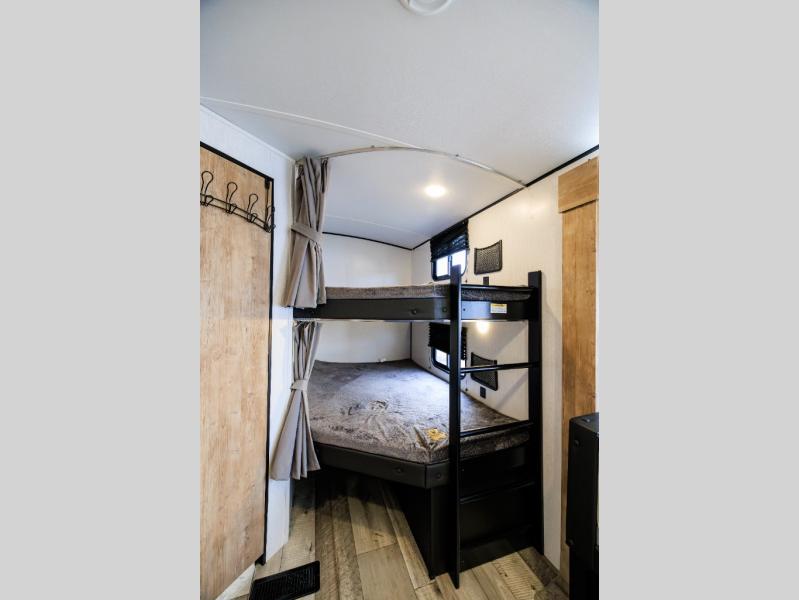 For the larger group, this Springdale is the perfect travel trailer because it features a set of double-size bunks, two entry doors, a large slide out, and sleeping for nine people. Step inside using the main entry and see just how spacious the combined kitchen and living area are. For a quiet retreat, enjoy the front bedroom where you can expect to get a great night's rest. The back of this trailer contains a set of double-size bunks that the kids or your friends will surely love. Or, you can easily take along extra guests. There is a convenient ladder to access the top bunk, and you will also enjoy the front exterior pass-through storage compartment for all of your outdoor camping gear.
