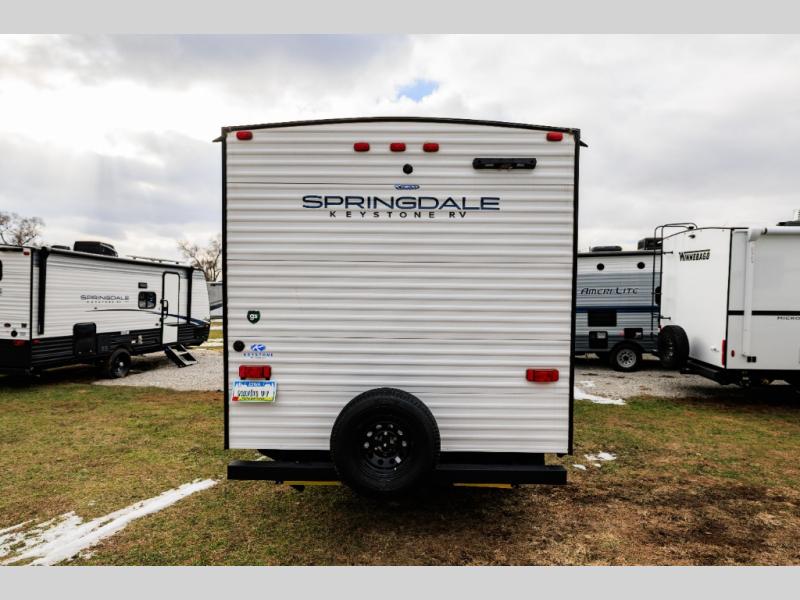 With any Keystone Springdale travel trailer, you will have a friction hinge entry door with sturdy MORryde StepAbove steps, a pass-through storage compartment for your outdoor gear, and reliable Dexter E-Z Lube axles to maneuver your Springdale down the road and into the campsites. Some of the Keystone Exclusives provide 12V color-coded wiring with easy-to-trace circuits which is better than conventional RV wiring allowing a faster diagnosis for quicker repairs, and the streamlined heat distribution that uses in-floor heat vents for more efficiency for uninterrupted air flow. Also included, the Blade high performance air flow system that delivers 30% more air flow. The interior gives you pressed kitchen countertops, pleated night shades, and designer upholstered window valances for easy care and style, and more depending on the Springdale you choose!