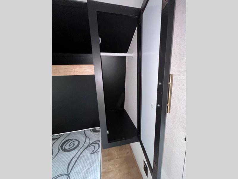 Bring the whole gang and explore with this bunkhouse travel trailer in tow! There is sleeping for up to 10 with double-size bunk beds, a queen bed up front, as well as a sofa and booth dinette that can accommodate more when reconfigured at night. You will easily be able to create meals to enjoy while camping inside with the three-burner range and a 10 cu. ft. 12V refrigerator. Overhead storage is available above the stove and sink and along the opposite side. There is also a front pass-through for housing all of your outdoor gear, as well as additional outside storage beneath the bunk beds. The 12' power awning will also provide more living space and outdoor protection from the sun and/or rain.