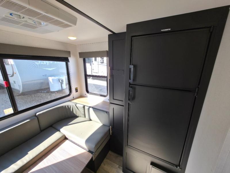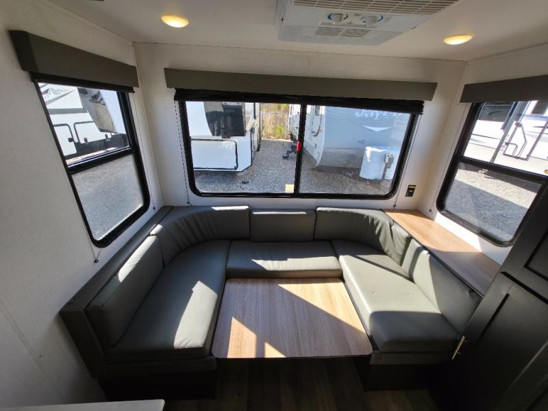 You will find lots of storage inside and outside this trailer allowing you to bring along everything you need for a great camping trip! Along the exterior there are two pass-through compartments for your outdoor gear and a 10' power awning giving you a covered outdoor living area to enjoy when you aren't inside. The cook will have a two burner cooktop to make meals, and the U-shaped dinette offers great views out of the panoramic windows. There is a full bathroom to get cleaned up in before bedtime, and a queen bed to fall asleep quickly so you can have fun again tomorrow.