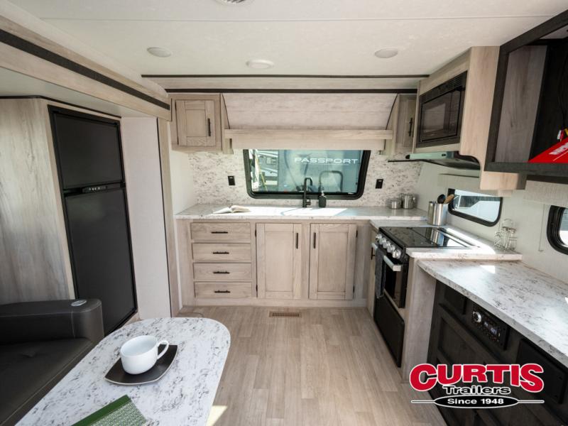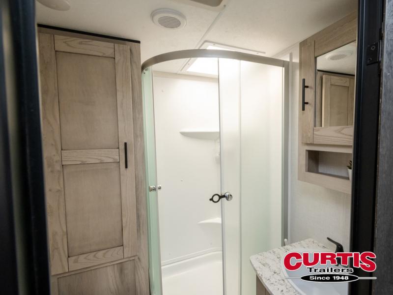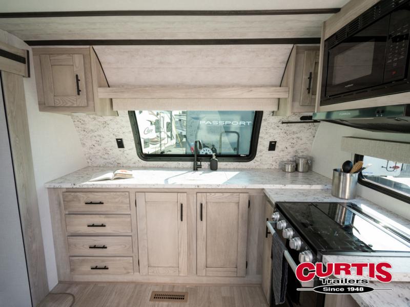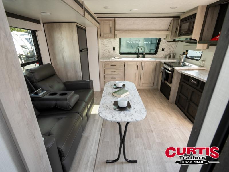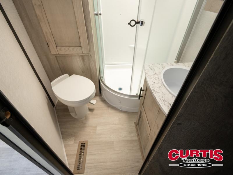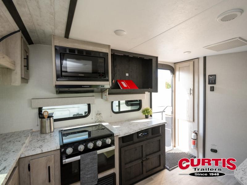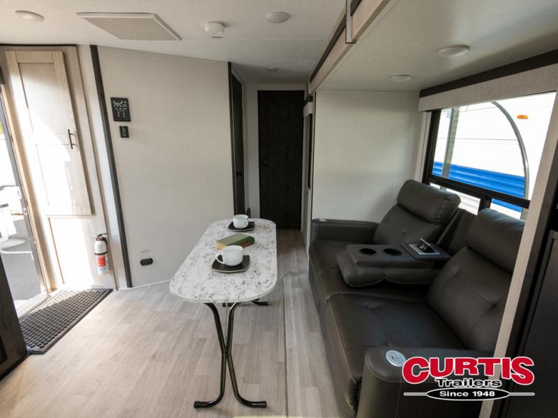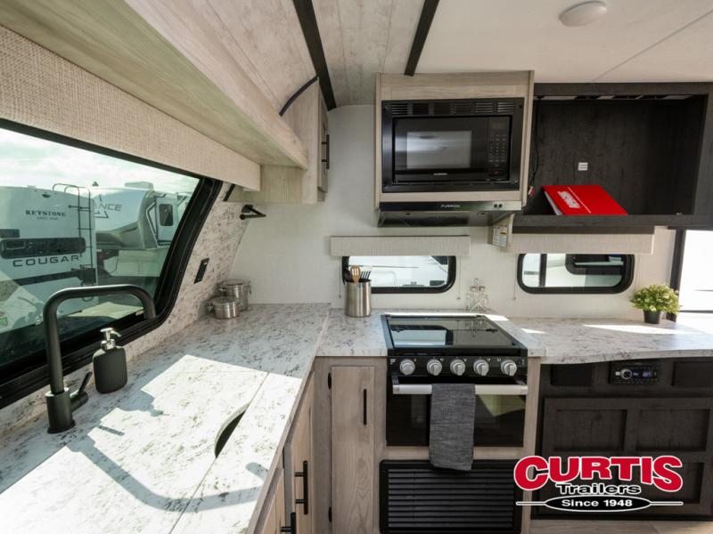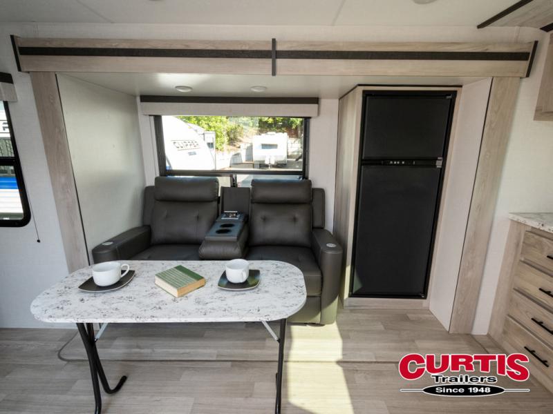 When you aren't hiking, fishing or shopping in town, you can relax inside this cozy travel trailer. There is theater seating with USB ports to charge your tablet, and a table in front to dine at. The chef will love the front kitchen with lots of counter space for preparing meals as well as drying the dishes beside the large sink. The 10 cu. ft. refrigerator and the pantry will hold your food items, and there is linen storage in the full bathroom with a radius shower. You will sleep like a queen in your own bedroom in the rear. Outside, you can enjoy the weather protected from the elements under the 18' power awning that includes an LED light strip so that you can relax into the evening. The mini outside kitchen with a griddle allows you to make meals while outdoors, and the pass-through storage in the rear gives you space for the larger camping gear.