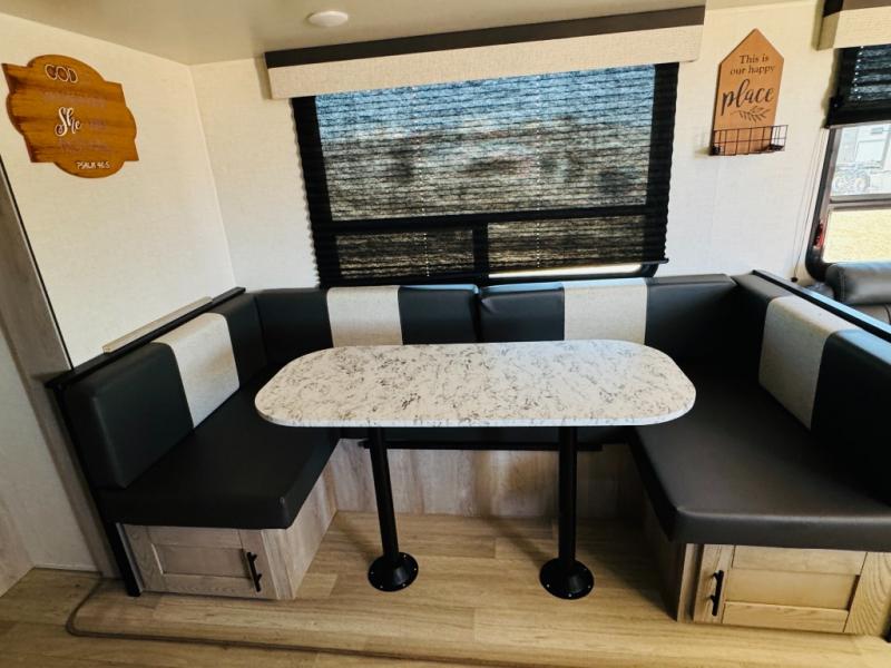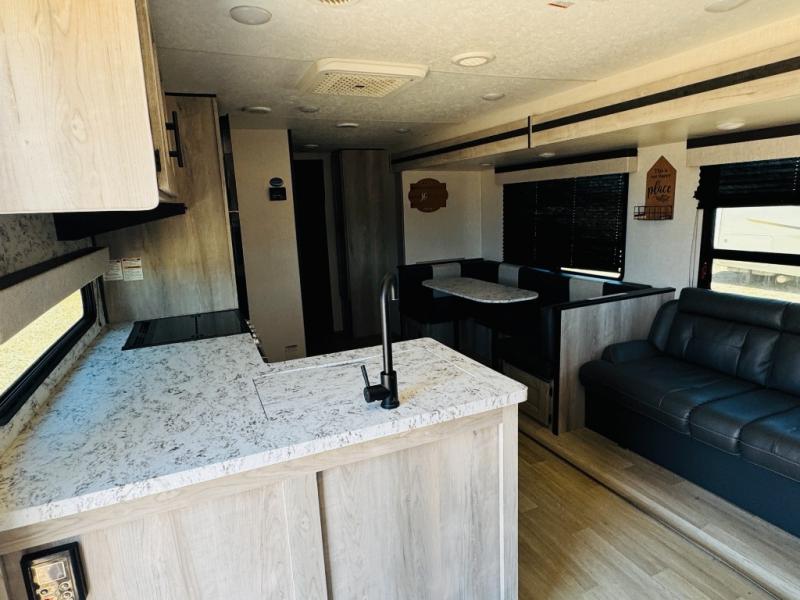 Your kids or your friends will love having their own privacy in the rear bunkhouse which offers two bunks and a dinette to play games or dine at, plus there is a closet for their storage. The full bathroom is conveniently located and includes the second exterior entry for quick and easy access to the fun happening outside. You will have your own private bedroom on the opposite side of the trailer, and it includes a walk-around queen bed, dual wardrobes and a sliding entry door. The main living and kitchen area is spacious with a large slide out, and you can relax on the 64" sofa or the 80" U-shaped dinette while the cook makes meals with full amenities including a 10 cu. ft. refrigerator and a pantry for food storage.