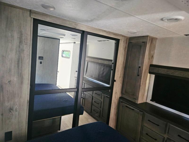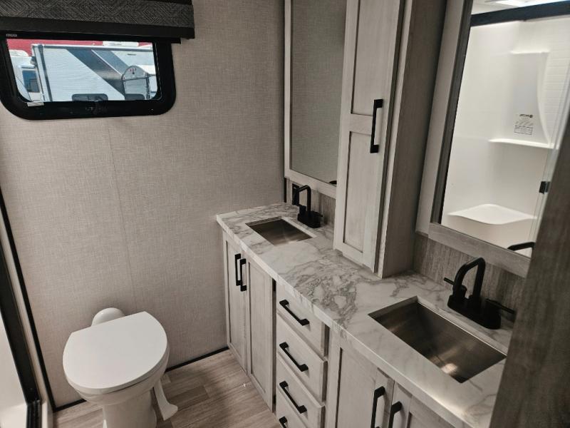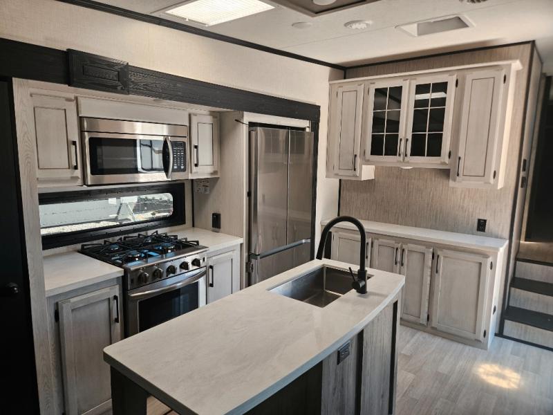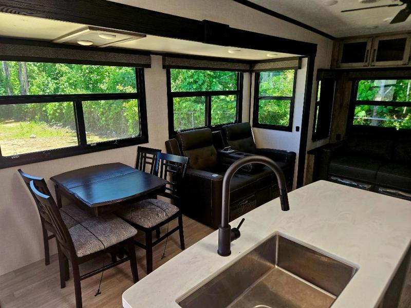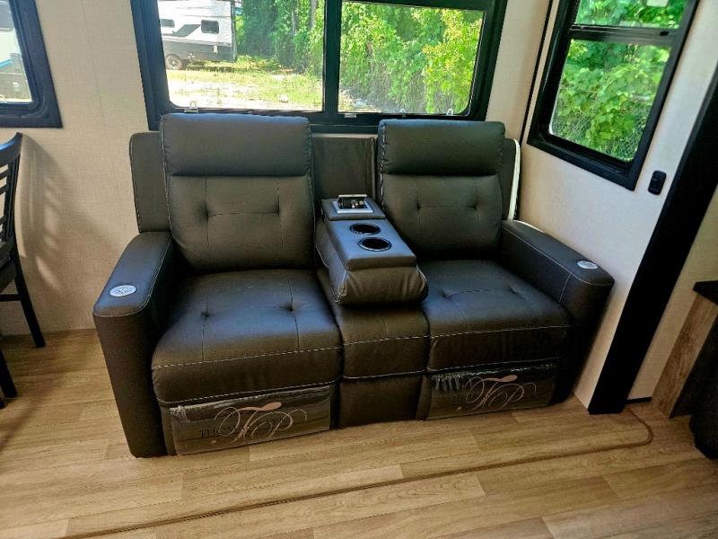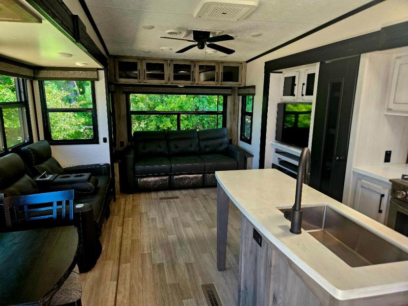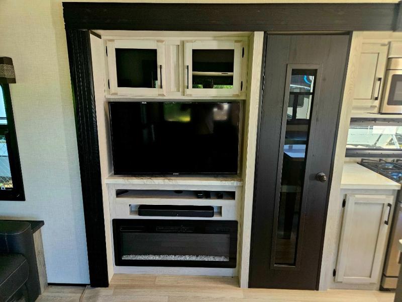 Don't pass up your chance to camp in true luxury with this fifth wheel! There is a kitchen island with two bar stools for others to help prepare dinner which can be either cooked on the four burner range or inside the 24" oven. The hutch can store your dishes and the large pantry can store your favorite snacks/canned goods. After a fun day at the beach, rinse the sand out in the 48" x 30" residential shower with a seat in the full bathroom, plus it has a dual sink vanity for two to get ready at once in the morning. When it's time to relax either lay down on the king bed slide in the front private bedroom or head to the rear living area where you can lay on the hide-a-bed sofa or sit in the theater seating with USB charging across from the entertainment center with a 40" fireplace and 43" smart LED TV to watch a movie!