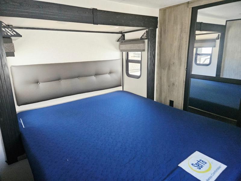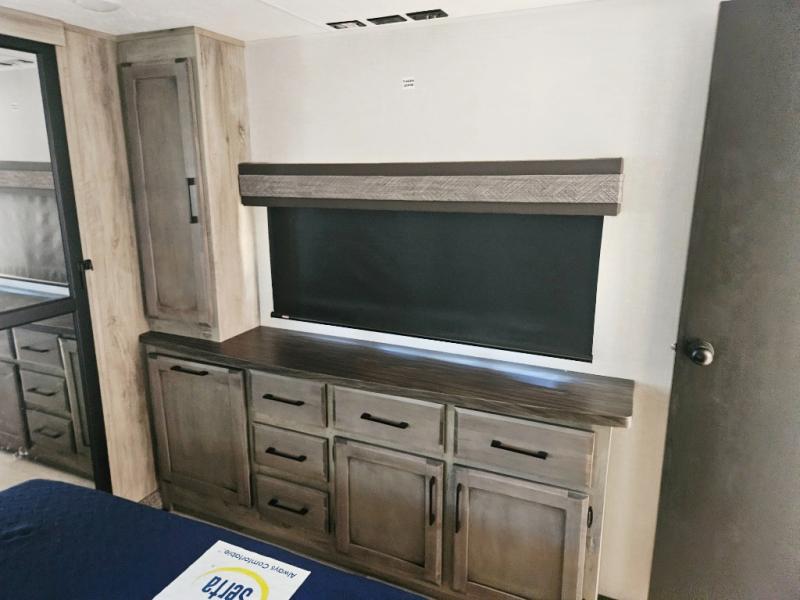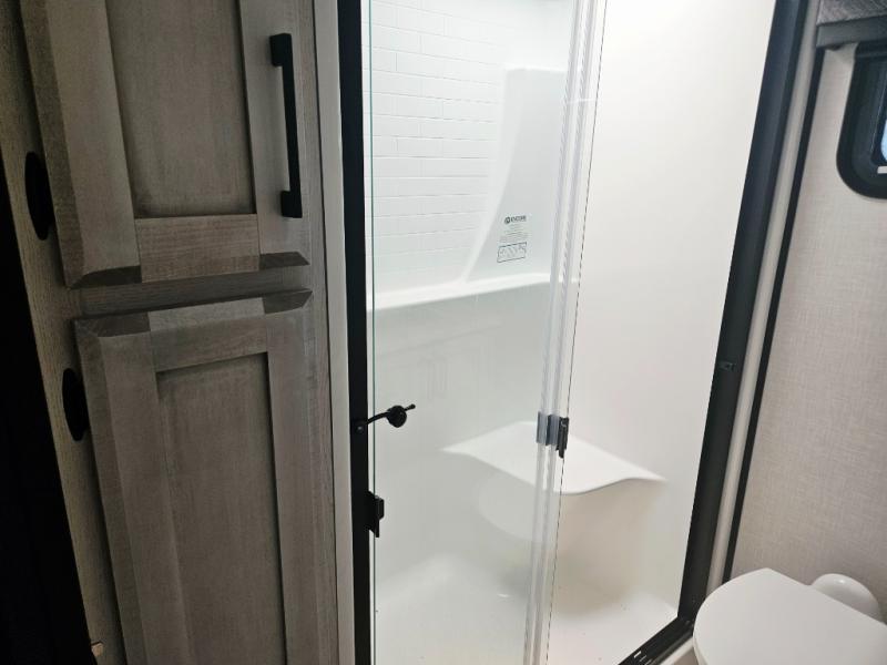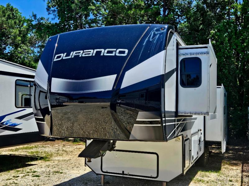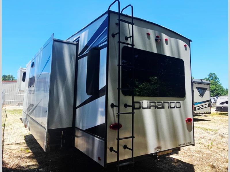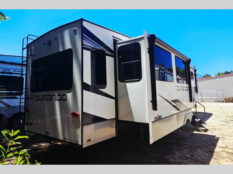 Enjoy full time living, an affordable price, and a wide body construction for more living space with every one of these KZ Durango light high-profile fifth wheels! These luxury units can be used all year round with the all-weather insulation package, the 3" x 14" foam-core in-floor straight-line heating system w/ a 35,000 BTU furnace, and the 15,000 BTU ducted roof A/C which optimizes the airflow by an average of 40% for better performance, cooling time, and reduction of noise. A few other construction features you will appreciate include a one piece, seamless walk-on Tufflex roofing material, Pex® in-floor heated waterlines, a Lamilux® gelcoat fiberglass exterior, and Dexter® axles with self adjusting brakes and height adjusting hangers. You can even head to the woods and go off-grid when you choose the optional off-the-grid solar package. Modern farmhouse cabinetry, a king size bed, and smart TVs will have you feeling like you never left home!