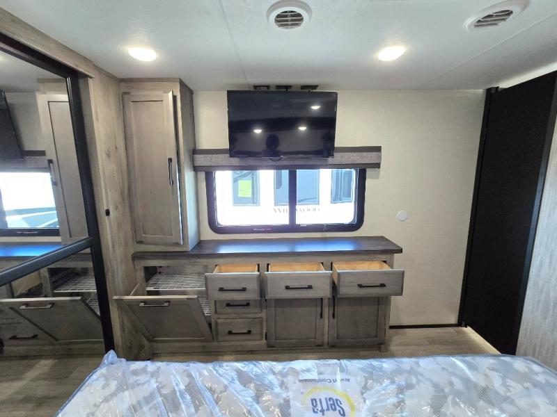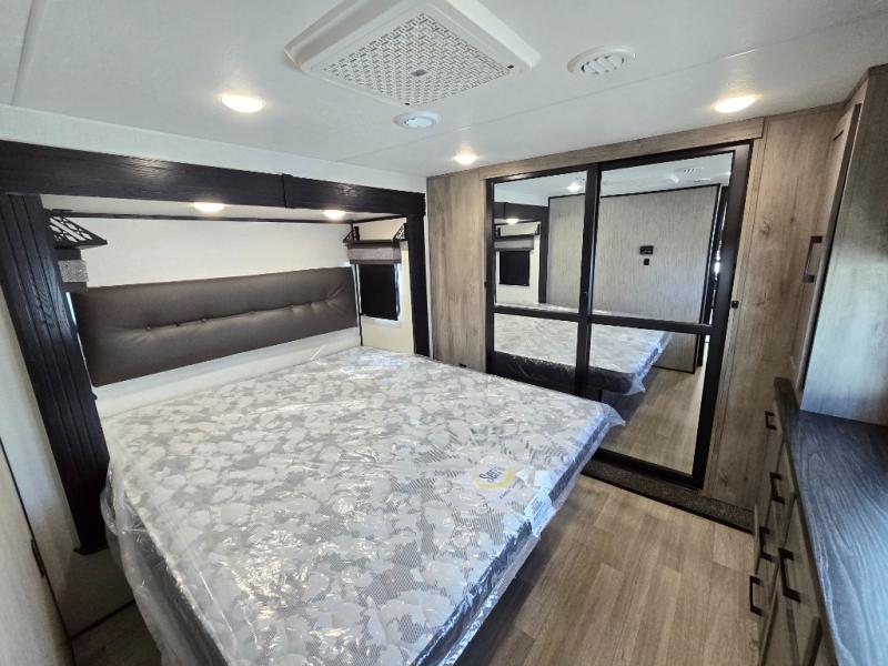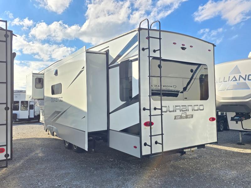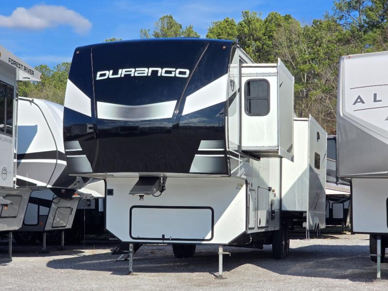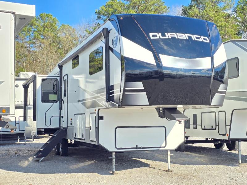 Enjoy full time living, an affordable price, and a wide body construction for more living space with every one of these KZ Durango light high-profile fifth wheels! These luxury units can be used all year round with the all-weather insulation package, the 3" x 14" foam-core in-floor straight-line heating system w/ a 35,000 BTU furnace, and the 15,000 BTU ducted roof A/C which optimizes the airflow by an average of 40% for better performance, cooling time, and reduction of noise. A few other construction features you will appreciate include a one piece, seamless walk-on Tufflex roofing material, Pex® in-floor heated waterlines, a Lamilux® gelcoat fiberglass exterior, and Dexter® axles with self adjusting brakes and height adjusting hangers. You can even head to the woods and go off-grid when you choose the optional off-the-grid solar package. Modern farmhouse cabinetry, a king size bed, and smart TVs will have you feeling like you never left home!