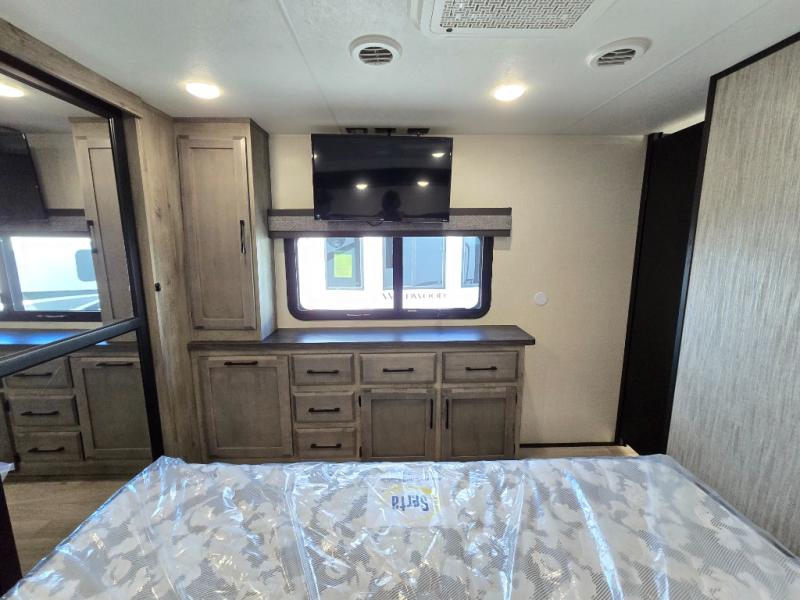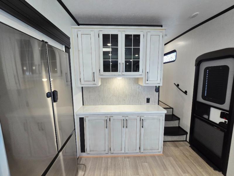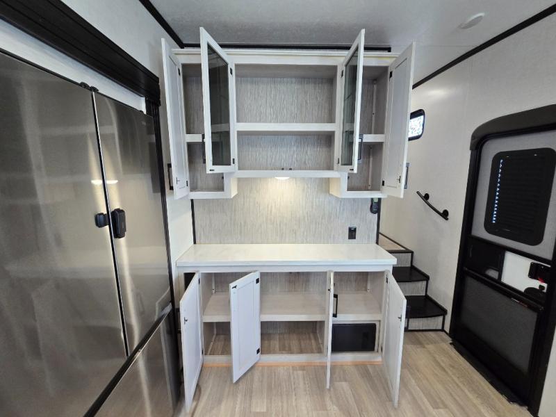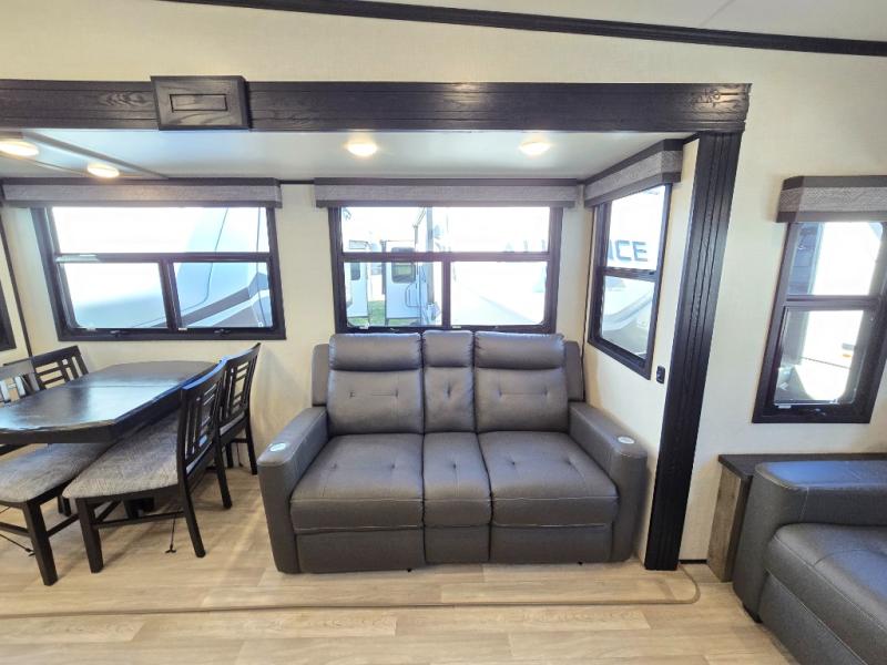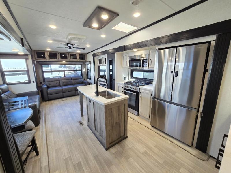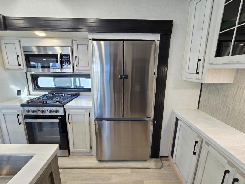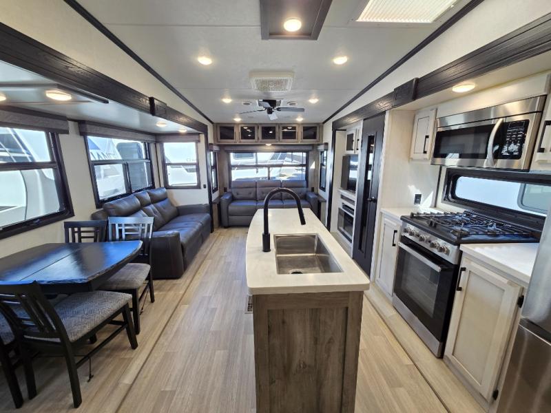 Don't pass up your chance to camp in true luxury with this fifth wheel! There is a kitchen island with two bar stools for others to help prepare dinner which can be either cooked on the four burner range or inside the 24" oven. The hutch can store your dishes and the large pantry can store your favorite snacks/canned goods. After a fun day at the beach, rinse the sand out in the 48" x 30" residential shower with a seat in the full bathroom, plus it has a dual sink vanity for two to get ready at once in the morning. When it's time to relax either lay down on the king bed slide in the front private bedroom or head to the rear living area where you can lay on the hide-a-bed sofa or sit in the theater seating with USB charging across from the entertainment center with a 40" fireplace and 43" smart LED TV to watch a movie!