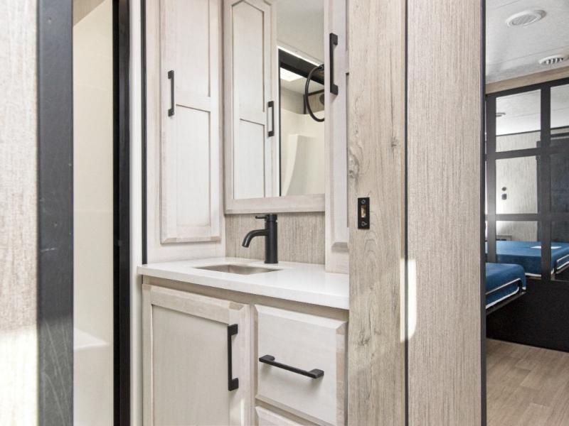 Designed for full-time living, the Durango Gold G382MBQ is equipped with high-end features such as a Serta Comfort foam king mattress, theater seating with heat, massage, and power recline, and a central vacuum system for ultimate convenience. The modern farmhouse cabinetry adds a stylish touch, while the upgraded kitchen appliances—including a 30" convection microwave, four-burner range, and stainless steel dishwasher—ensure your culinary needs are met.