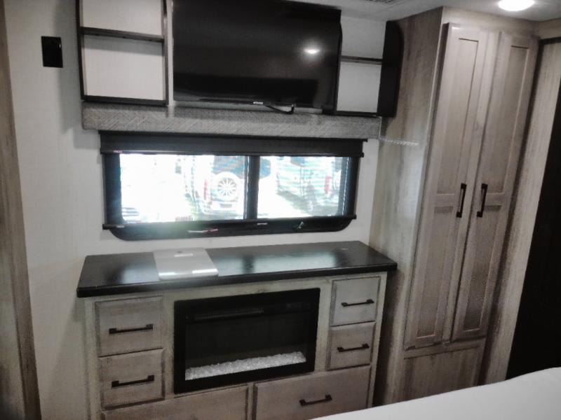 Spacious Front Living Area: Relax in the expansive front living room featuring two hide-a-bed sofas and theater seating with heat, massage, and power recline/decline functions. Enjoy entertainment on the 65-inch LED TV paired with a JBL 2.0 sound bar and a 40-inch wide-view fireplace.