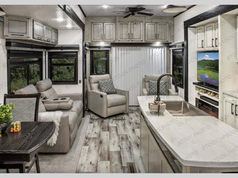 With any KZ Durango Gold full-time luxury fifth wheel, you will enjoy the look of modern farmhouse cabinetry, upgraded kitchen appliances such as a 30" convection microwave and 24" oven with four burner range, plus a stainless dishwasher. Other top features include an electric tilt bed with Serta Comfort foam king mattress, theater seating with cupholders and a USB plug, plus heat, massage, and power recline/decline features. You will also appreciate a handy central vacuum system with multiple attachments that stores out of sight. Each Durango Gold is constructed with six-sided aluminum framing, and has heated, insulated and an enclosed underbelly. It is also constructed with Tufflex roofing material which is flexible, puncture resistant, and reflective. Some additional standout features include a fully-vented attic system, and a Durango Towing package which includes a 2" towing receiver hitch with 4-pin wire harness connection. This will provide you with 3,000 lbs. of towing capacity. Come choose your favorite lightweight high-profile wide body luxury fifth wheel today!