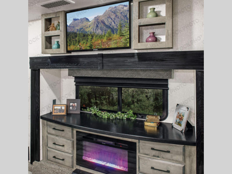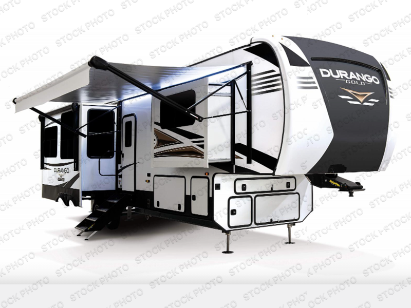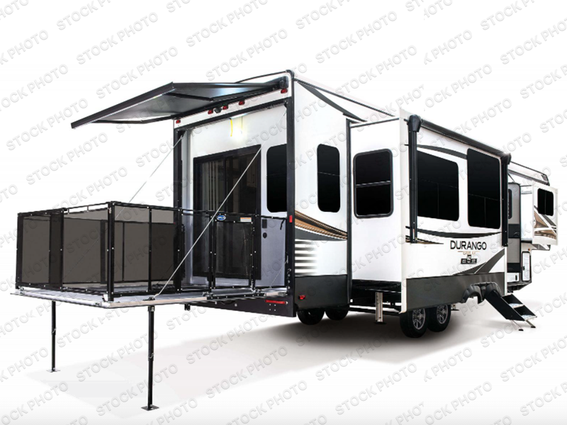 The unique patio deck on this Durango Gold offers a raised area to enjoy the great outdoors at a tailgate event, a big race, or just because you want this type of living space. You can also relax outside near the main entry under the 17' electric awning with an LED light strip, and there is exterior storage for your camping chairs, charcoal. and outdoor games. Back inside, you will love relaxing in the main living and kitchen area while you watch the 50" Smart LED TV with a fireplace below it while sitting in the chairs or on the hide-a-bed sofa which offers sleeping space. The legless table and chairs is a great place to dine, or you can choose the full-timer's desk option if you need to work on occasion. The cook will love all their amenities including the kitchen island with a farmhouse stainless steel sink, the solid surface countertops, and the hutch next to the pantry. The master bedroom is up front just beyond the full bathroom which includes a residential shower with a seat and linen storage. The bedroom provides an electric tilt king bed slide for more floor space and has drawers underneath the bed. You will find another slide with a dresser and the 32" Smart LED TV.