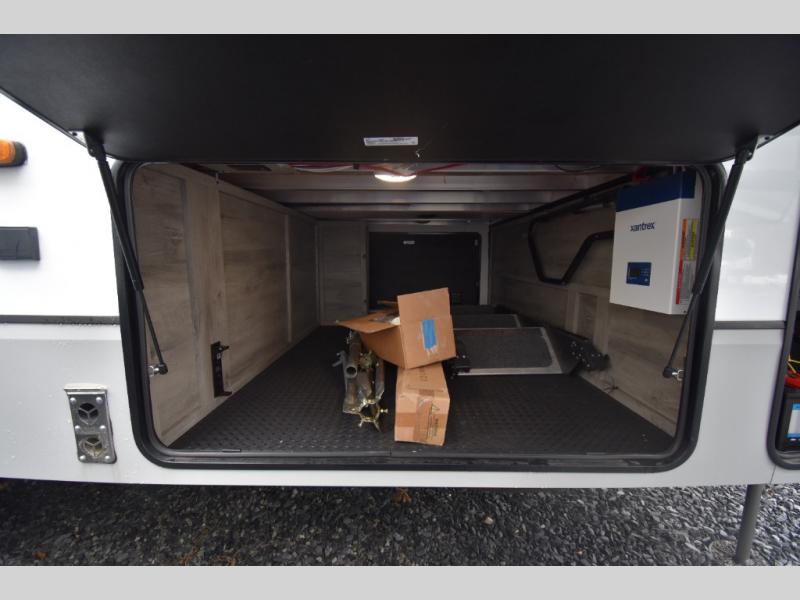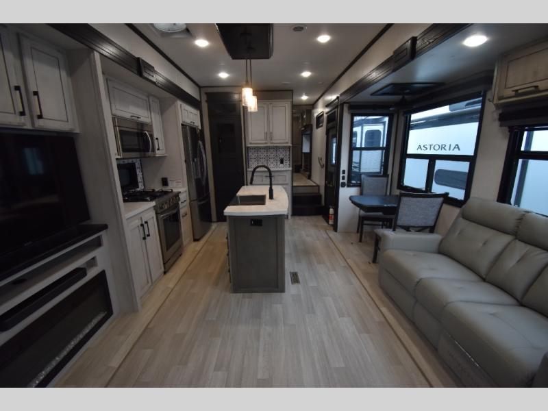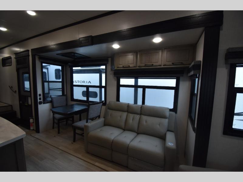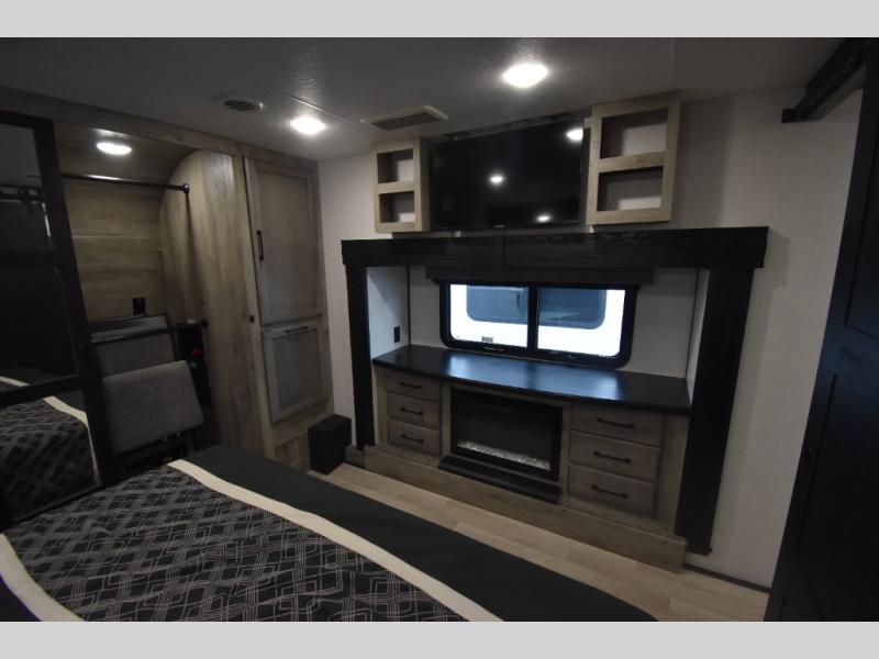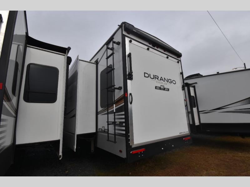 The unique patio deck on this Durango Gold offers a raised area to enjoy the great outdoors at a tailgate event, a big race, or just because you want this type of living space. You can also relax outside near the main entry under the 17' electric awning with an LED light strip, and there is exterior storage for your camping chairs, charcoal. and outdoor games. Back inside, you will love relaxing in the main living and kitchen area while you watch the 50" Smart LED TV with a fireplace below it while sitting in the chairs or on the hide-a-bed sofa which offers sleeping space. The legless table and chairs is a great place to dine, or you can choose the full-timer's desk option if you need to work on occasion. The cook will love all their amenities including the kitchen island with a farmhouse stainless steel sink, the solid surface countertops, and the hutch next to the pantry. The master bedroom is up front just beyond the full bathroom which includes a residential shower with a seat and linen storage. The bedroom provides an electric tilt king bed slide for more floor space and has drawers underneath the bed. You will find another slide with a dresser and the 32" Smart LED TV.