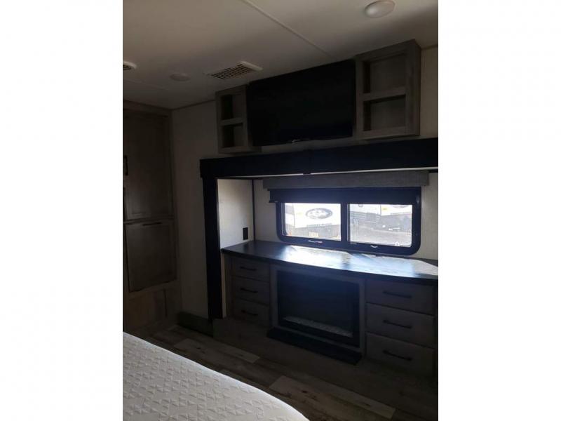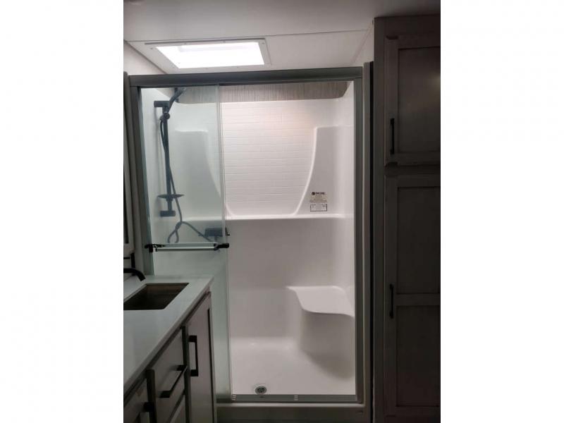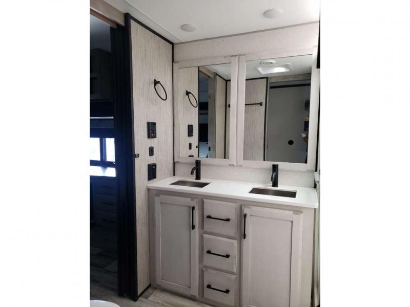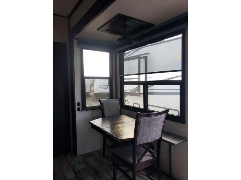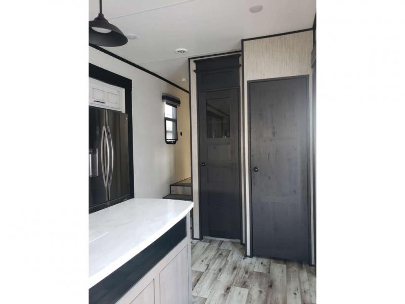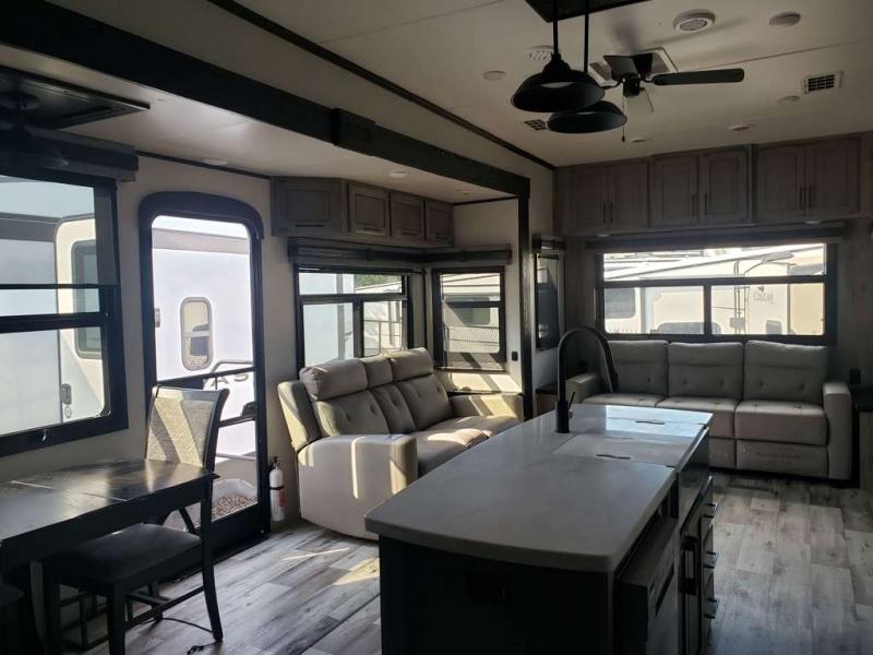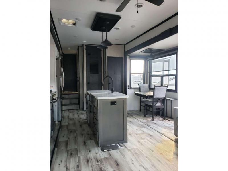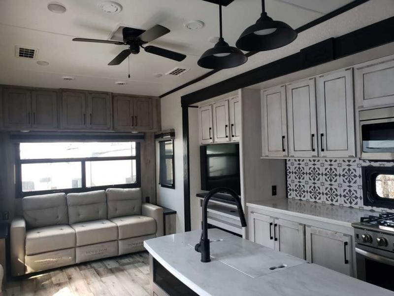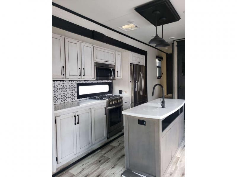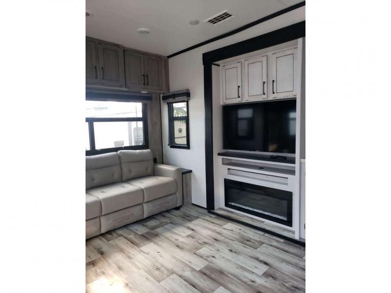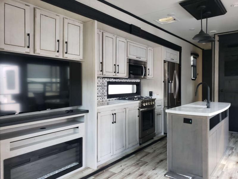 Travel to relax, work, and live in this fifth wheel to experience the ultimate luxury and comfort anywhere you setup camp! The flip-up solid step entry makes it sturdy and safe to enter and exit through the slide out which offers a legless table with chairs on one side and theater seating on the end of it. As you enjoy the spacious living and kitchen area, the cook can make full meals including holiday favorites using the residential appliances, and a farmhouse stainless steel sink in the center island, plus solid surface countertops are both beautiful and easy to clean. There is a pantry as well as a washer/dryer prepped space nearby which both come in handy for storage. You can watch the 50" Smart LED TV with fireplace below while playing games or working at the dining table or while sitting on any of the furniture. And the hide-a-bed sofa allows you to invite overnight guests to stay.