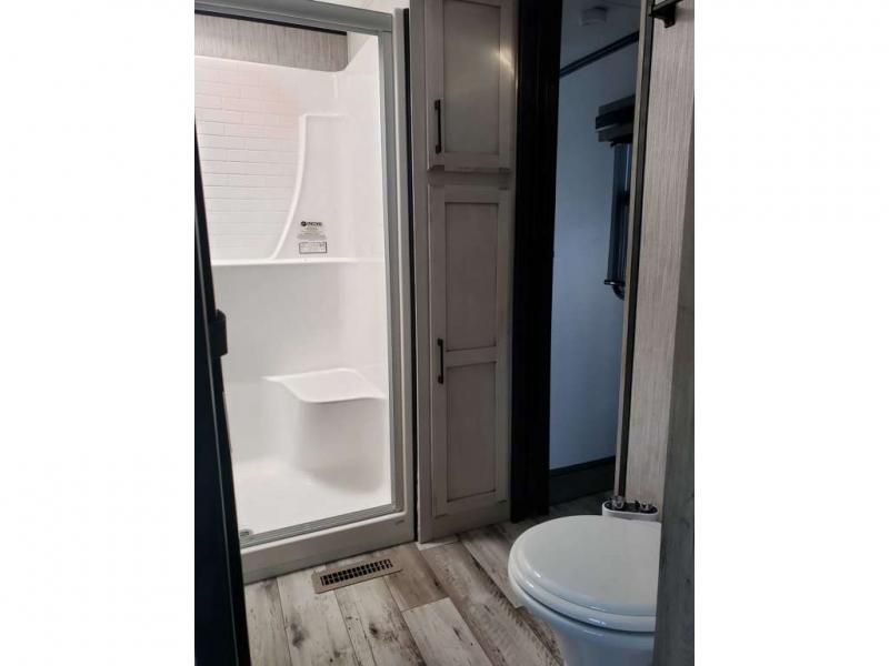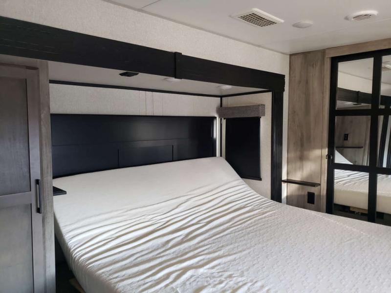 With any KZ Durango Gold full-time luxury fifth wheel, you will enjoy the look of modern farmhouse cabinetry, upgraded kitchen appliances such as a 30" convection microwave and 24" oven with four burner range, plus a stainless dishwasher. Other top features include an electric tilt bed with Serta Comfort foam king mattress, theater seating with cupholders and a USB plug, plus heat, massage, and power recline/decline features. You will also appreciate a handy central vacuum system with multiple attachments that stores out of sight. Each Durango Gold is constructed with six-sided aluminum framing, and has heated, insulated and an enclosed underbelly. It is also constructed with Tufflex roofing material which is flexible, puncture resistant, and reflective. Some additional standout features include a fully-vented attic system, and a Durango Towing package which includes a 2" towing receiver hitch with 4-pin wire harness connection. This will provide you with 3,000 lbs. of towing capacity. Come choose your favorite lightweight high-profile wide body luxury fifth wheel today!