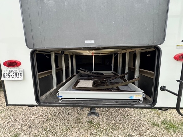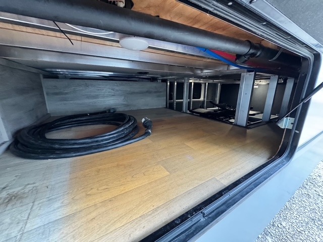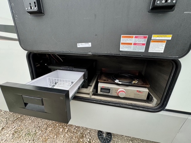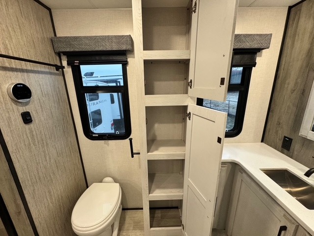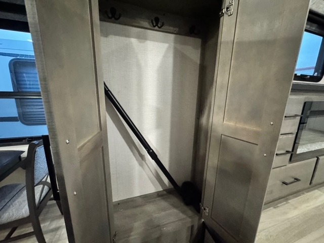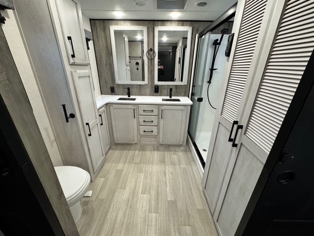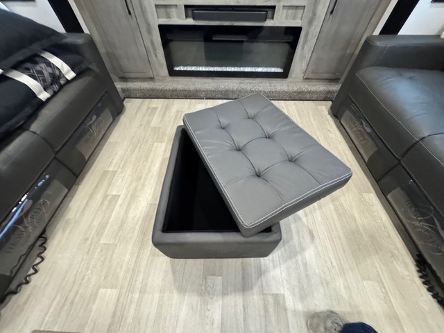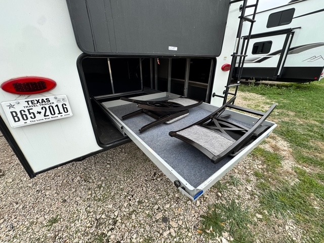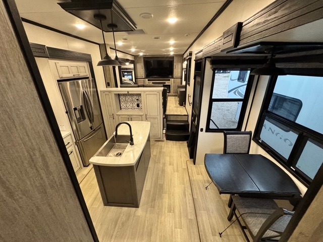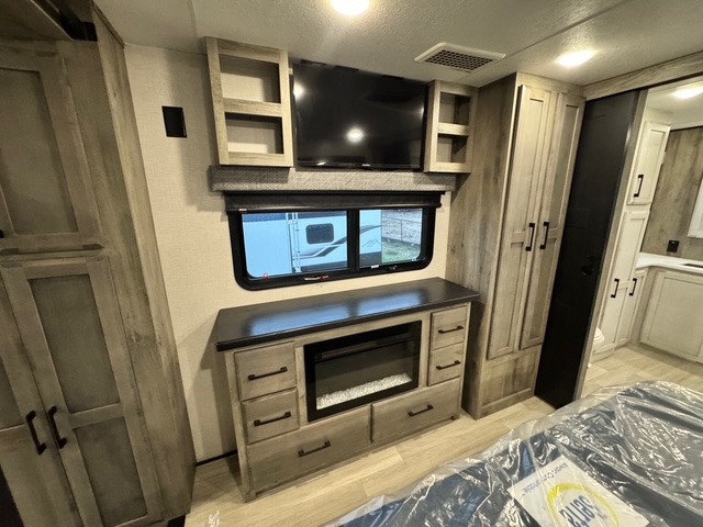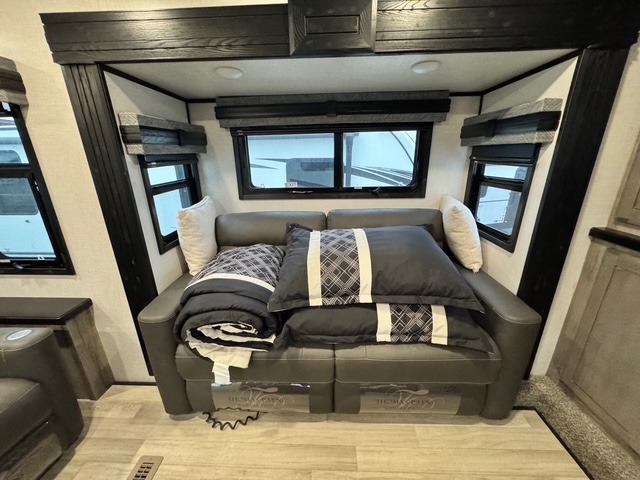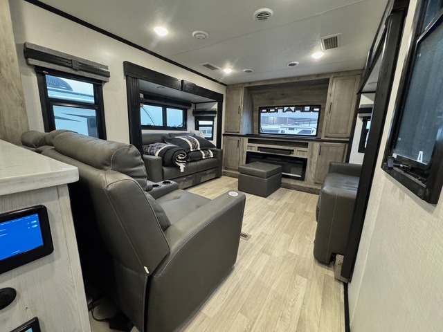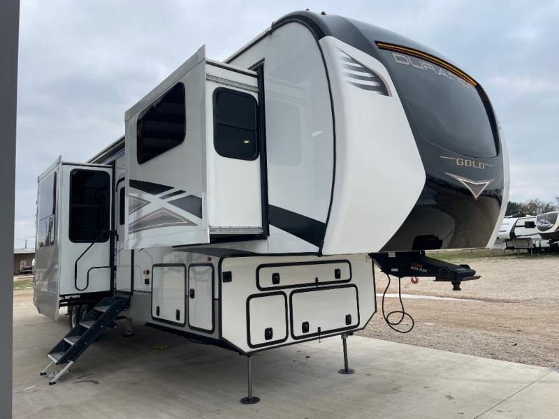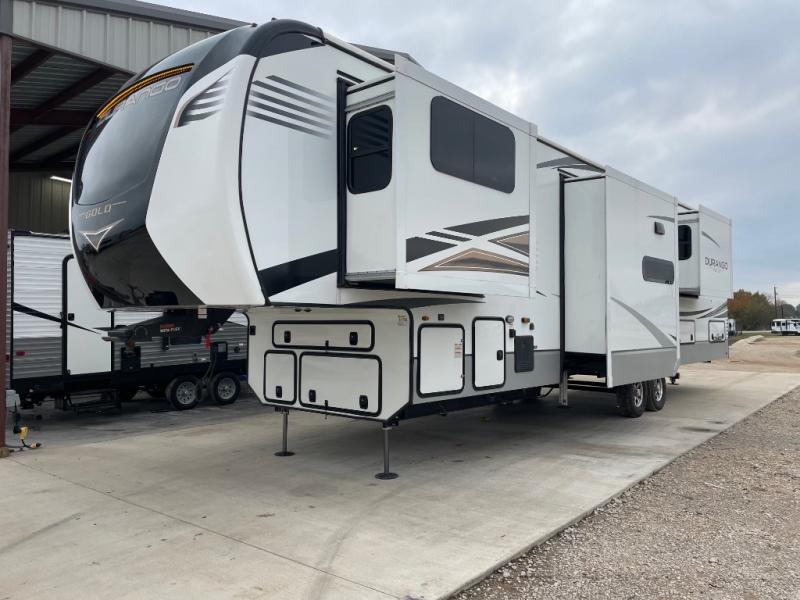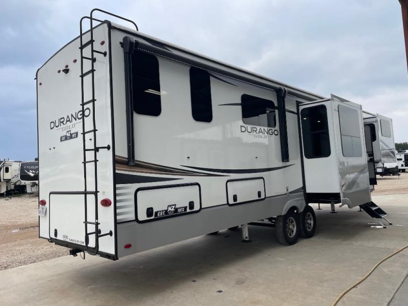 Looking for a full-featured fifth wheel to live in? Well look no further than this Durango Gold with lots of storage, lots of interior space, and lots of extra features that will provide comfort, convenience and luxury. The unique rear storage with slide out tray gives you a larger area to carry your golf clubs, seasonal clothing and gear, plus totes and such in a motion-lit, fully finished, heated and sealed basement storage. And if you are looking for a separate area for yourself, the front includes an entertainment center with a 65" LED TV and 48" fireplace below, a front windshield, theater seating, and two hide-a-bed sofa slide outs providing seating and sleeping space for friends and family. The middle, separate kitchen, is spacious as well with two slides including residential appliances, a legless table with four chairs, and a hutch/pantry. The half bath is an added convenience that you will appreciate. The bedroom offers an electric-tilt king bed, or choose a queen option. There is drawer storage under the bed and also a dresser with hidden storage as well as a wardrobe. The rear full bathroom is attached and includes dual sinks so two people can get ready at once, plus there is a washer/dryer prepped space to add that super convenient option. And there is an outside kitchen with a griddle, more exterior storage, and a 17' electric awning, plus an 13' optional awning as well.