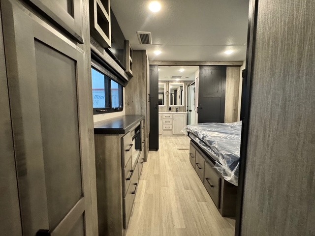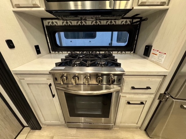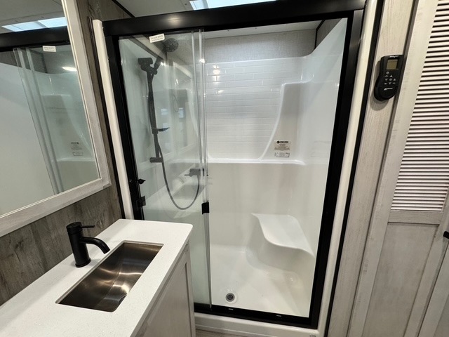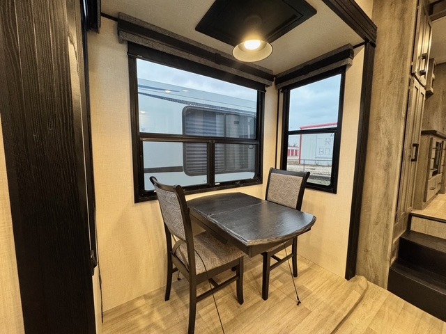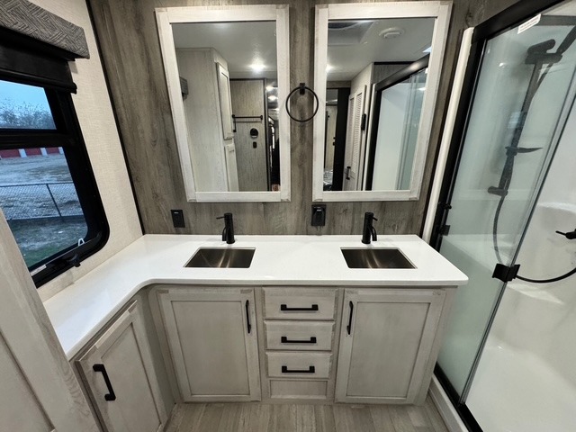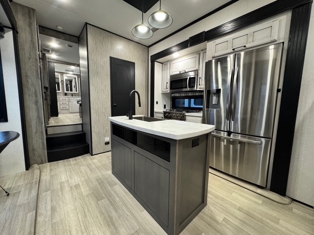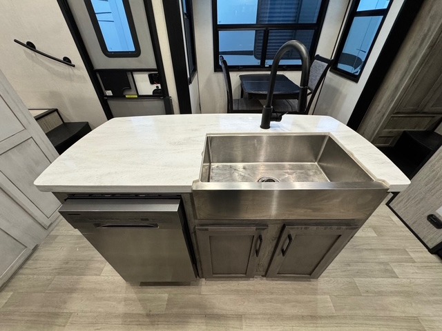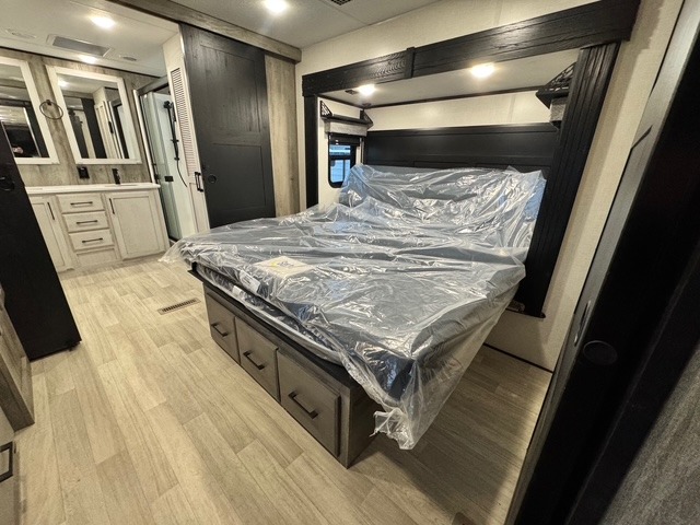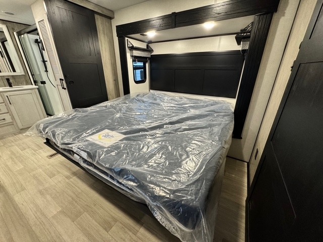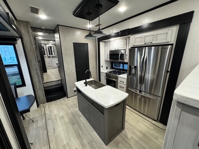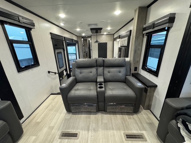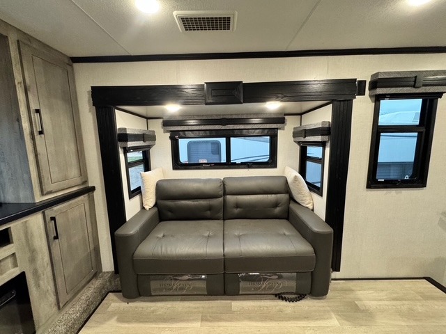 With any KZ Durango Gold full-time luxury fifth wheel, you will enjoy the look of modern farmhouse cabinetry, upgraded kitchen appliances such as a 30" convection microwave and 24" oven with four burner range, plus a stainless dishwasher. Other top features include an electric tilt bed with Serta Comfort foam king mattress, theater seating with cupholders and a USB plug, plus heat, massage, and power recline/decline features. You will also appreciate a handy central vacuum system with multiple attachments that stores out of sight. Each Durango Gold is constructed with six-sided aluminum framing, and has heated, insulated and an enclosed underbelly. It is also constructed with Tufflex roofing material which is flexible, puncture resistant, and reflective. Some additional standout features include a fully-vented attic system, and a Durango Towing package which includes a 2" towing receiver hitch with 4-pin wire harness connection. This will provide you with 3,000 lbs. of towing capacity. Come choose your favorite lightweight high-profile wide body luxury fifth wheel today!