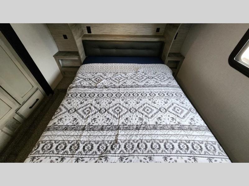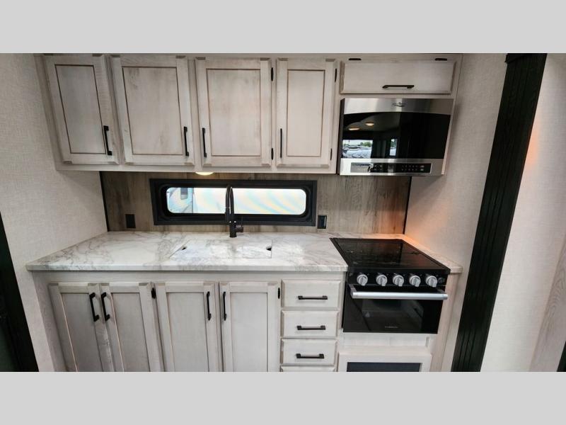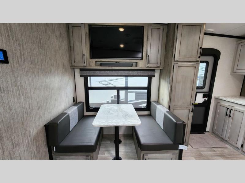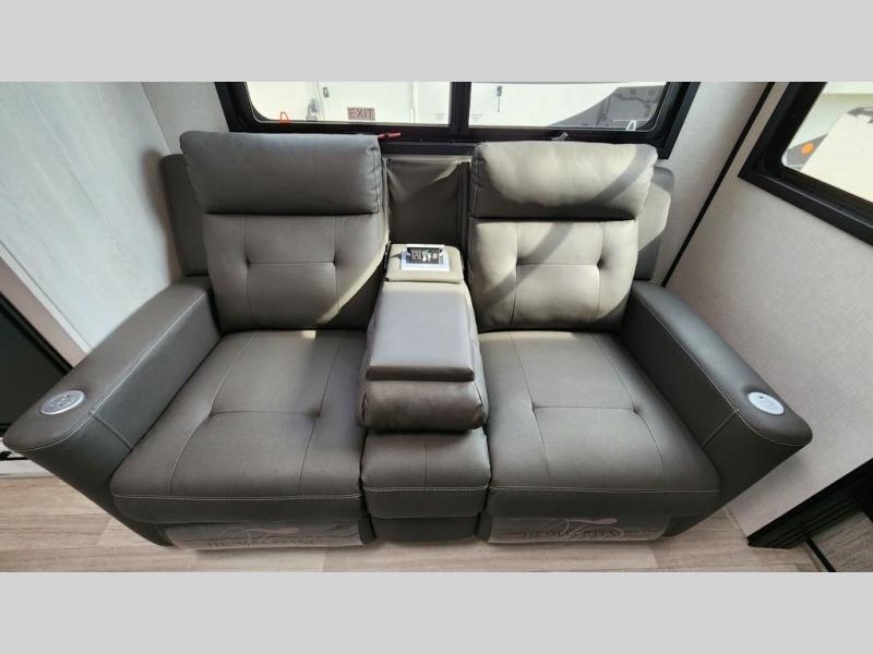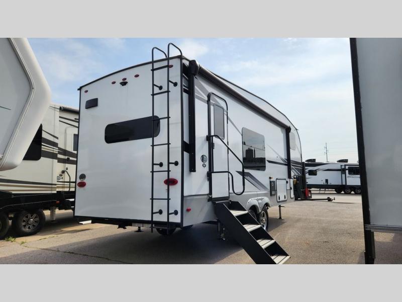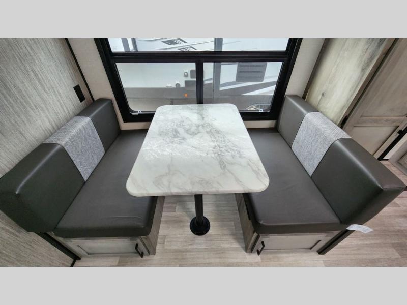 This rear kitchen fifth wheel is perfect for weekend trips to the lake. You will love how much counter space you have in the kitchen, as well as a pantry to store dry goods, a three burner drop-in cooktop with a glass cover, and a 8 cu. ft. gas/electric refrigerator. Your crew can relax on the hide-a-bed sofa or play a game at the booth dinette after dinner is done, or you can head outdoors to visit under the 18' power awning. Choose the theater seating option in place of the hide-a-bed sofa if you're not needing the additional sleeping space. The front private bedroom will make you feel right at home with its queen bed, slide out wardrobe, and a closet with washer and dryer prep!