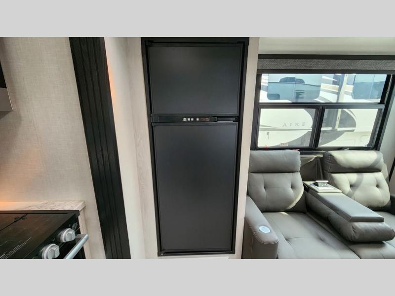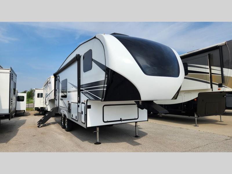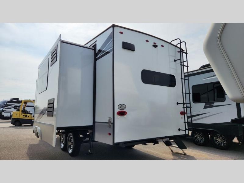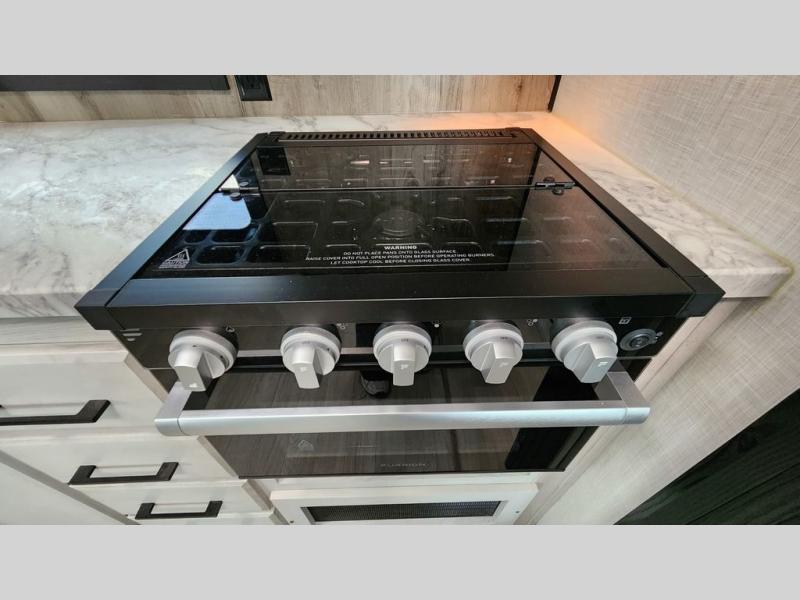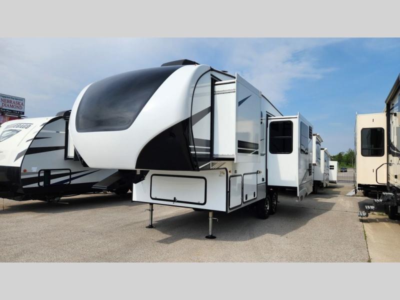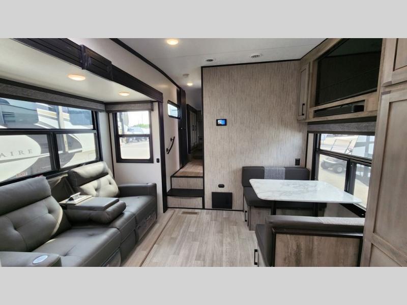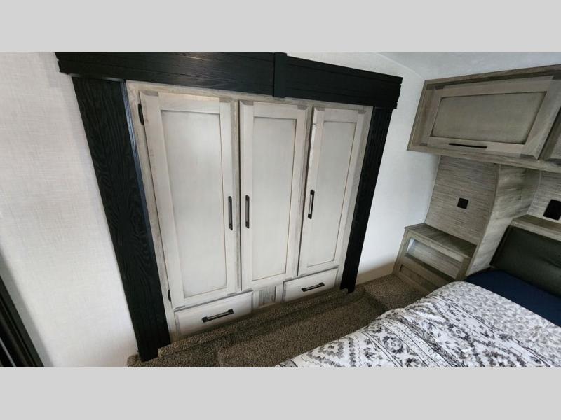 This rear kitchen fifth wheel is perfect for weekend trips to the lake. You will love how much counter space you have in the kitchen, as well as a pantry to store dry goods, a three burner drop-in cooktop with a glass cover, and a 8 cu. ft. gas/electric refrigerator. Your crew can relax on the hide-a-bed sofa or play a game at the booth dinette after dinner is done, or you can head outdoors to visit under the 18' power awning. Choose the theater seating option in place of the hide-a-bed sofa if you're not needing the additional sleeping space. The front private bedroom will make you feel right at home with its queen bed, slide out wardrobe, and a closet with washer and dryer prep!