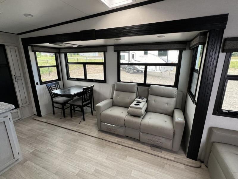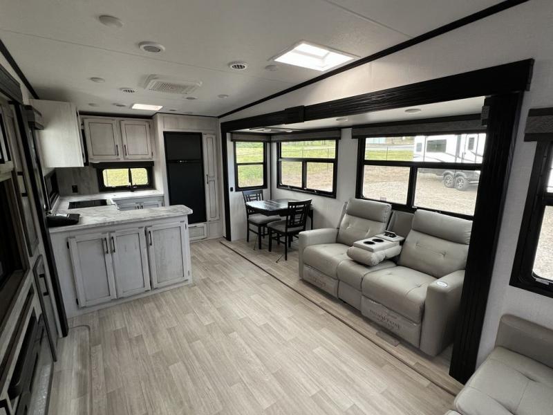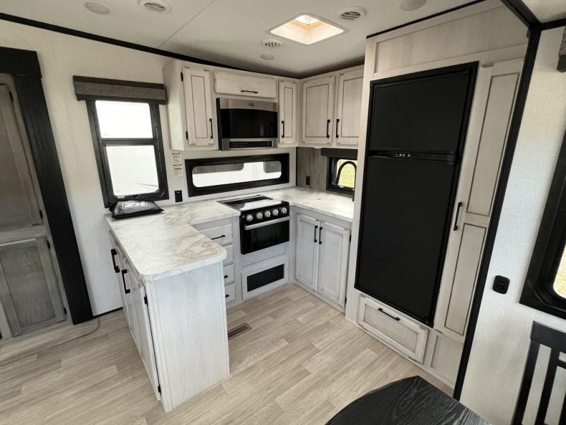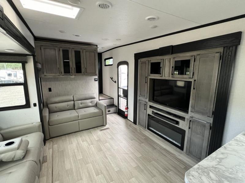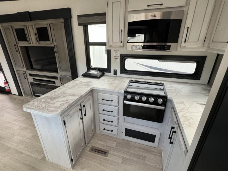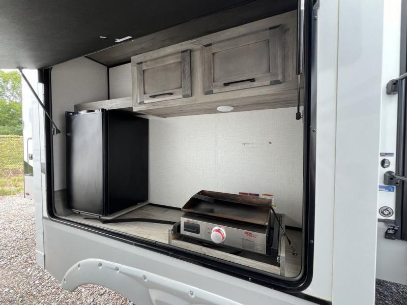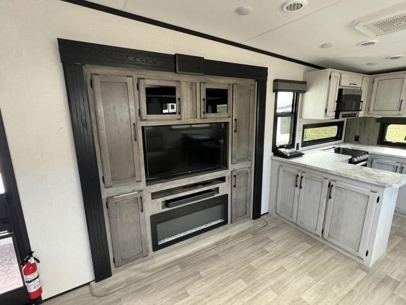 Escape the hustle and bustle of city life for weekends in this cozy fifth wheel. The dual opposing slides in the main living area will create an open floorplan, and you can choose an optional 40" fireplace here for a more at-home feel. There is also an entertainment center and a 43" Smart LED TV for movie night. If the weather is nice, head outdoors to relax under the 14' power awning while the chef of your group cooks on the outside kitchen. The rear kitchen inside features tons of counter space, an 8 cu. ft. gas/electric refrigerator, plus a pantry for dry goods. And don't overlook the front private bedroom with its slide out wardrobe, a closet with washer and dryer prep, and a queen bed!