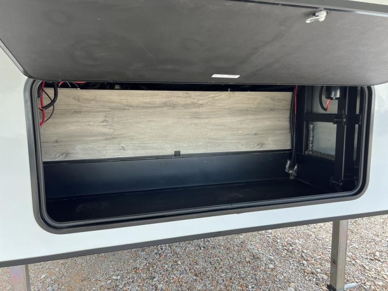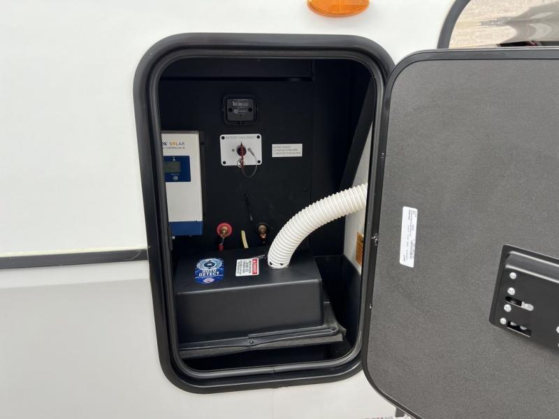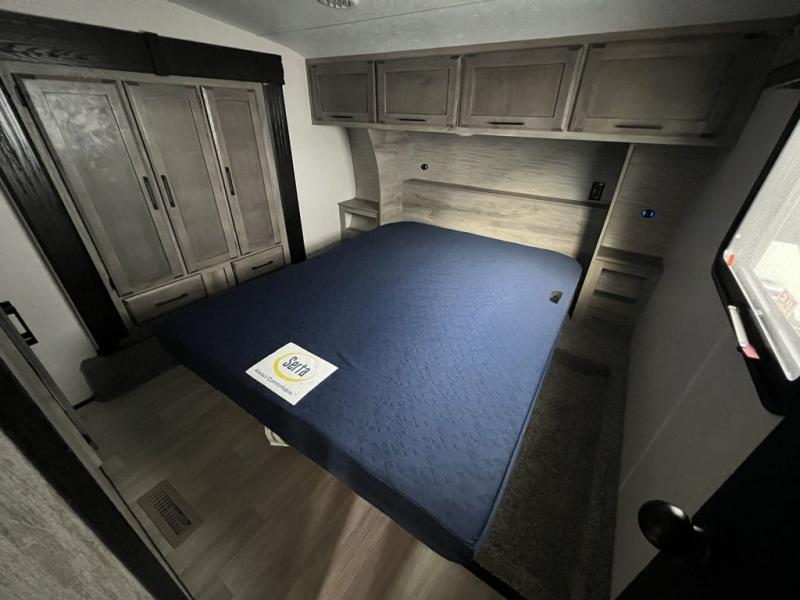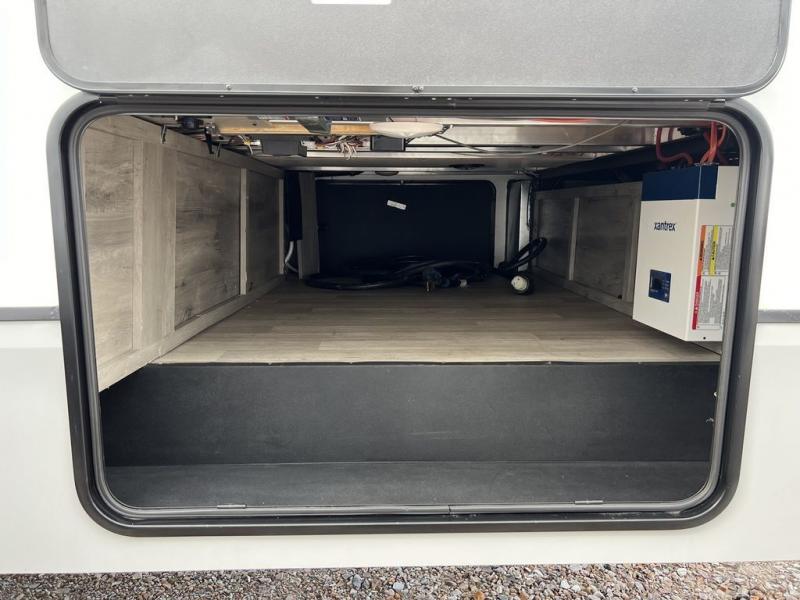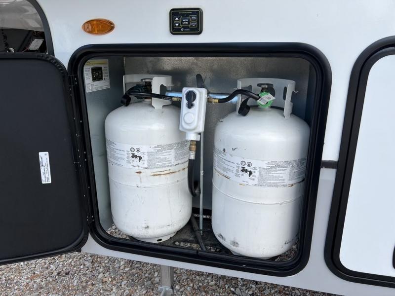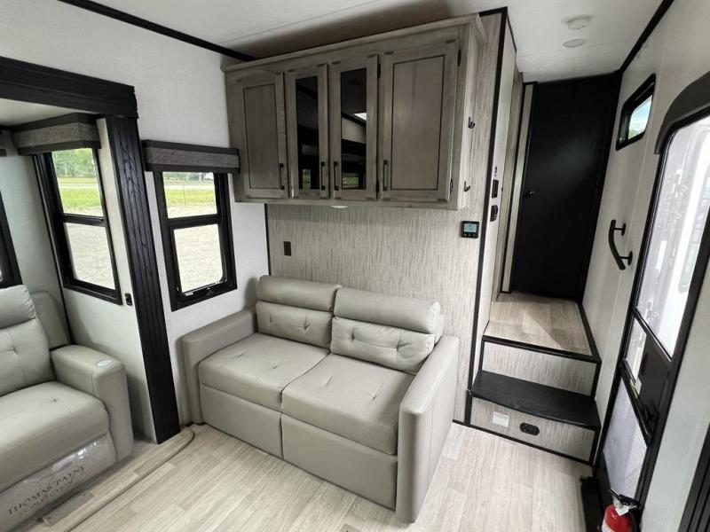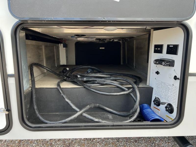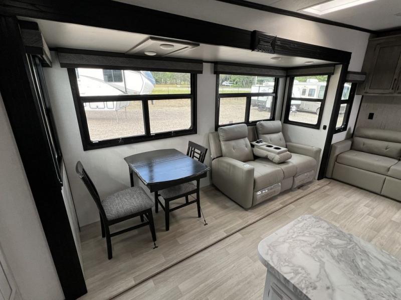 Escape the hustle and bustle of city life for weekends in this cozy fifth wheel. The dual opposing slides in the main living area will create an open floorplan, and you can choose an optional 40" fireplace here for a more at-home feel. There is also an entertainment center and a 43" Smart LED TV for movie night. If the weather is nice, head outdoors to relax under the 14' power awning while the chef of your group cooks on the outside kitchen. The rear kitchen inside features tons of counter space, an 8 cu. ft. gas/electric refrigerator, plus a pantry for dry goods. And don't overlook the front private bedroom with its slide out wardrobe, a closet with washer and dryer prep, and a queen bed!