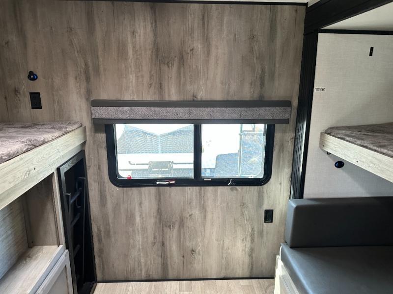 Your guests will feel right at home when they go camping with you since they will have their own bunkhouse suite with a half bath! There are three bunks here, plus an entertainment center if they choose to add a TV. The spacious full bath is up by the front private bedroom, and here you'll enjoy a queen bed, a slide out wardrobe, plus a closet with washer and dryer prep. Everyone can meet in the main living area at the booth dinette, or on the theater seating, plus this area includes a 43" Smart LED TV and an optional 40" fireplace can be added. Head outdoors to cook on the outside kitchen that includes a griddle, a sink, plus a refrigerator. There is also a 13' power awning here, and a second optional 11" awning can be added for even more shade!