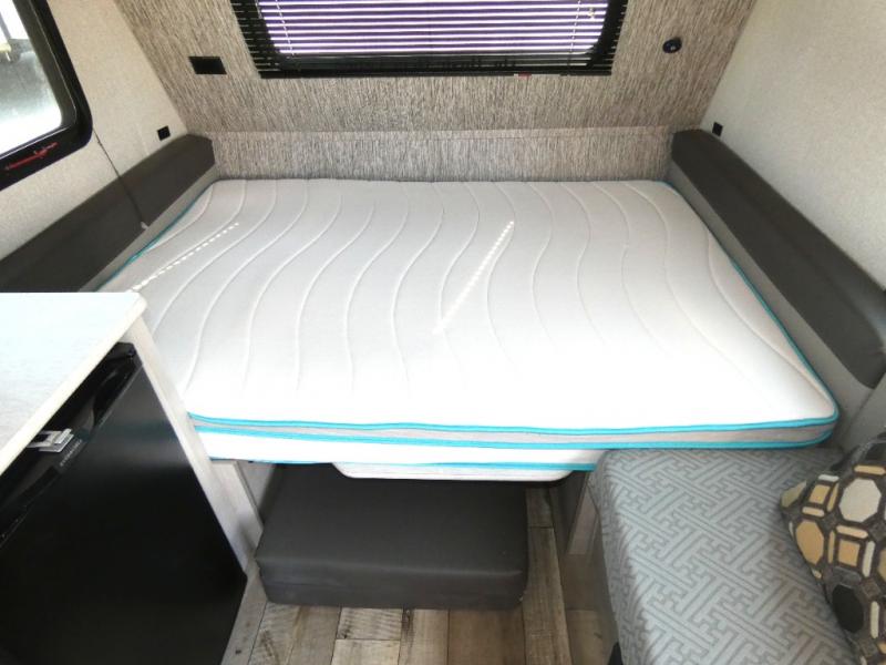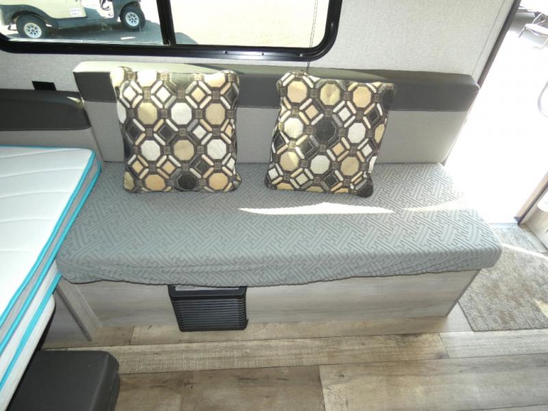 Your tent-camping days are over with this cute travel trailer that can sleep two to three people each night. The front 54" booth dinette can be used as dining and sleeping space, and there is a sofa for more seating and sleeping space. Prepare your meals on the two burner cooktop, and the single bowl sink will make clean-up a breeze.