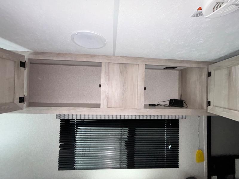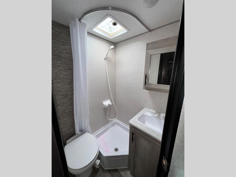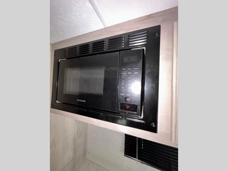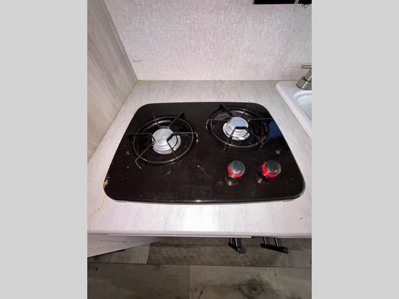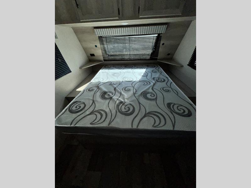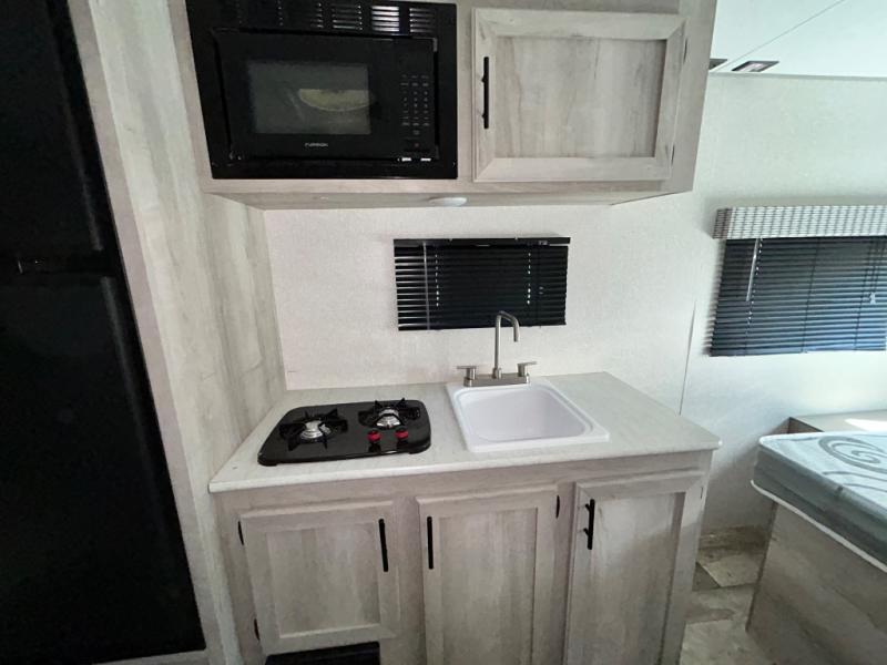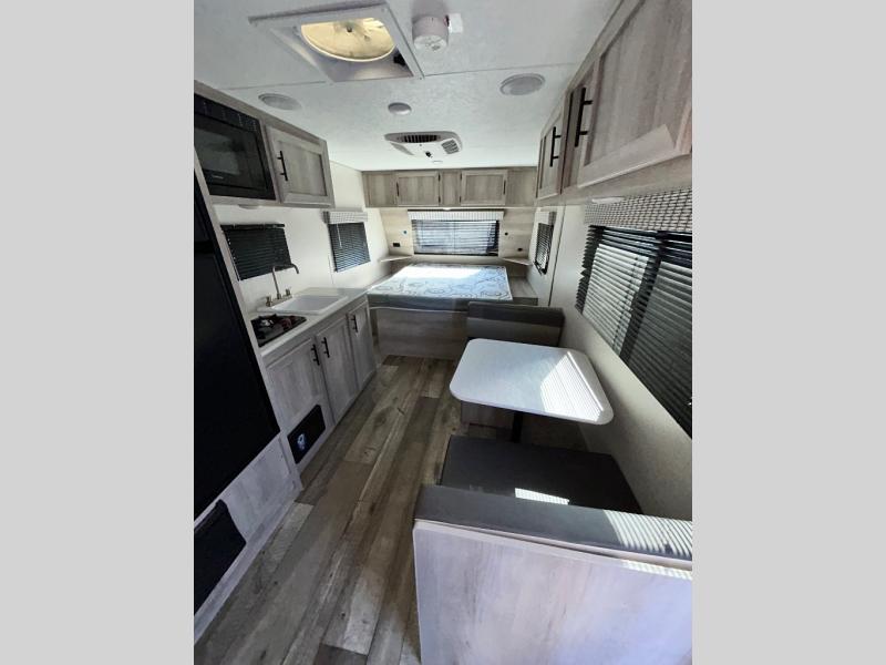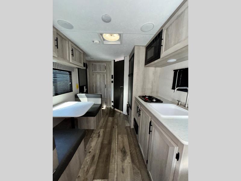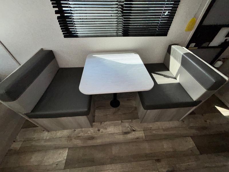 This travel trailer will feel just like home with its full bath, walk-around queen bed, and plenty of storage space for your belongings. Once you arrive at the campground, grab your fishing poles from the pass-through storage and head down to the river. You can get cleaned up in the full bath before heading to the kitchen to prepare a meal on the two burner cooktop or in the microwave oven. There is a comfortable booth dinette to dine at, and this space can double as sleeping space for overnight guests or two little ones.
