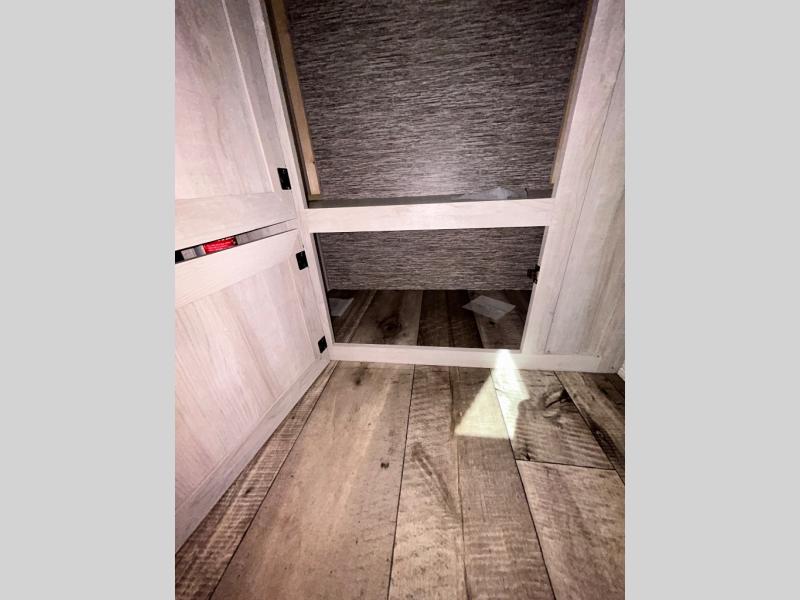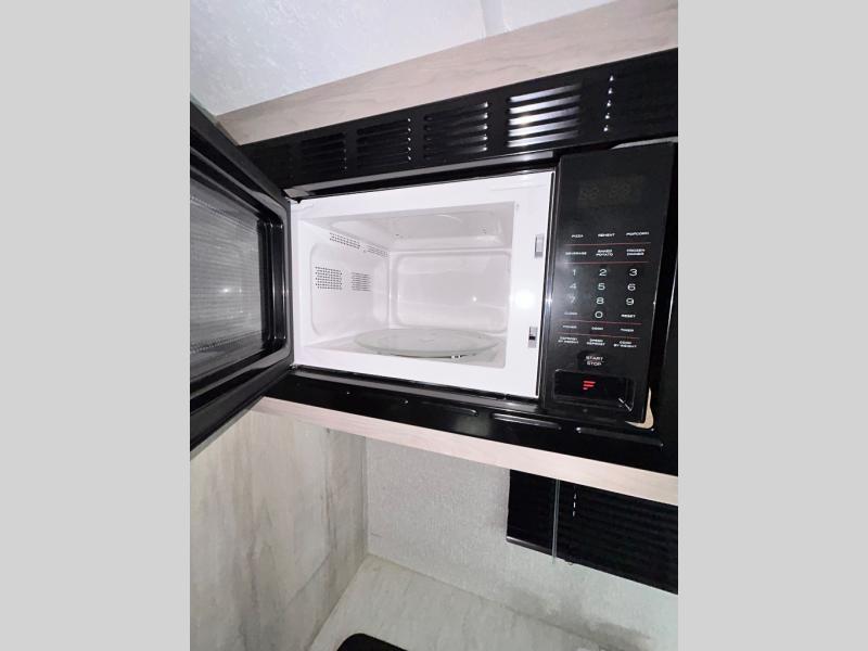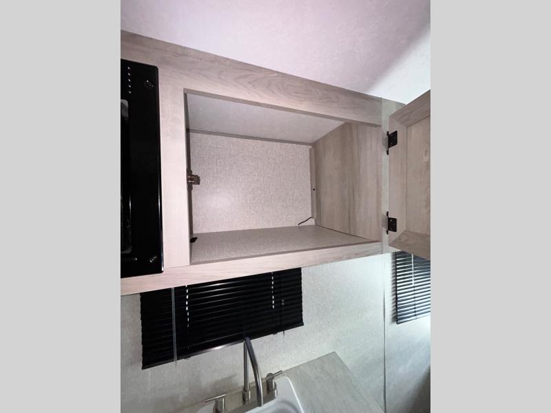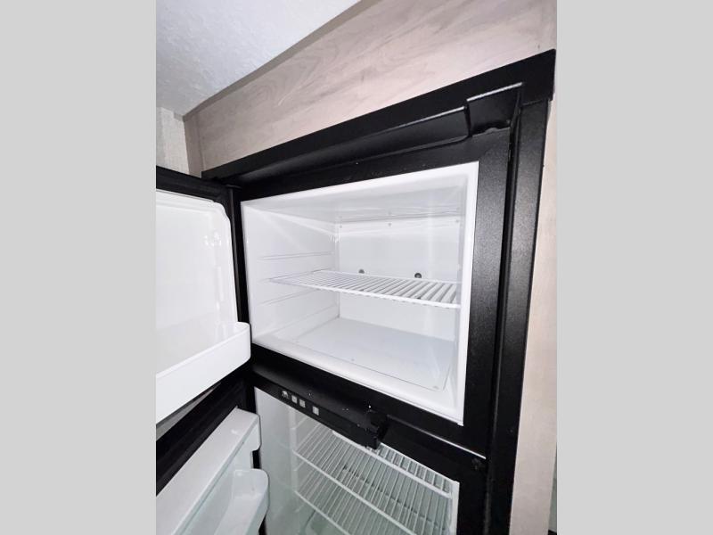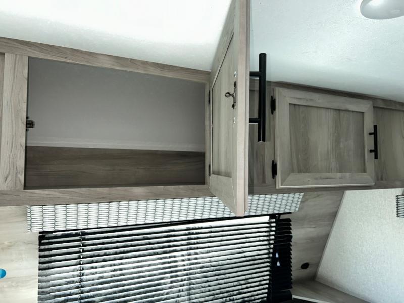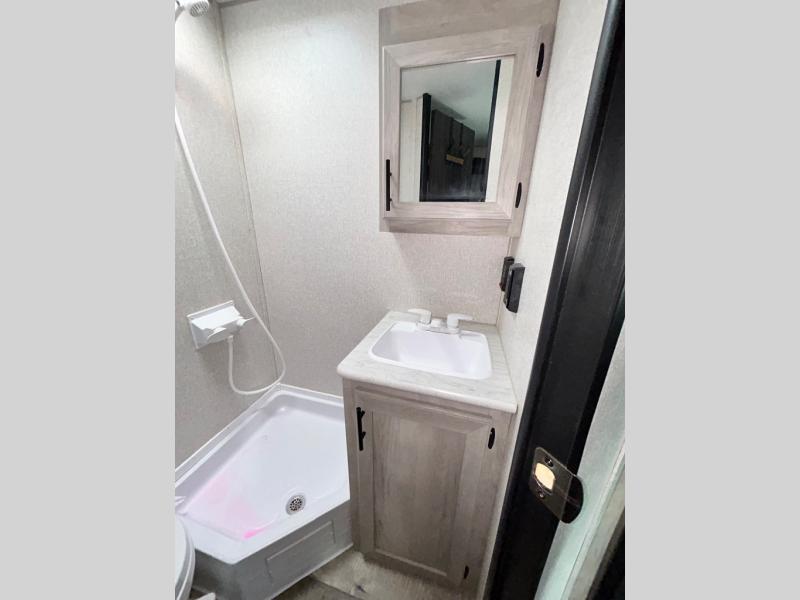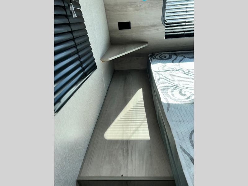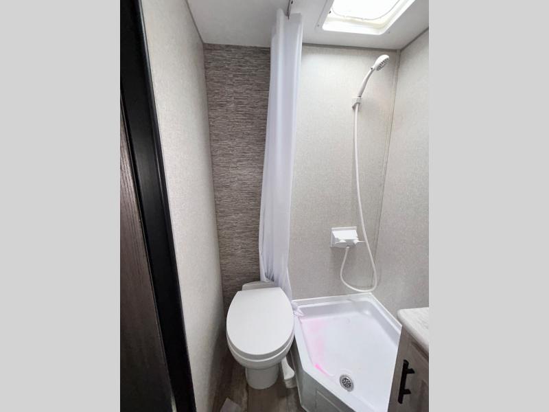 This travel trailer will feel just like home with its full bath, walk-around queen bed, and plenty of storage space for your belongings. Once you arrive at the campground, grab your fishing poles from the pass-through storage and head down to the river. You can get cleaned up in the full bath before heading to the kitchen to prepare a meal on the two burner cooktop or in the microwave oven. There is a comfortable booth dinette to dine at, and this space can double as sleeping space for overnight guests or two little ones.