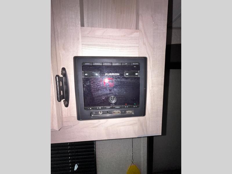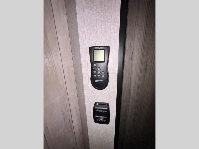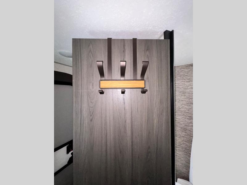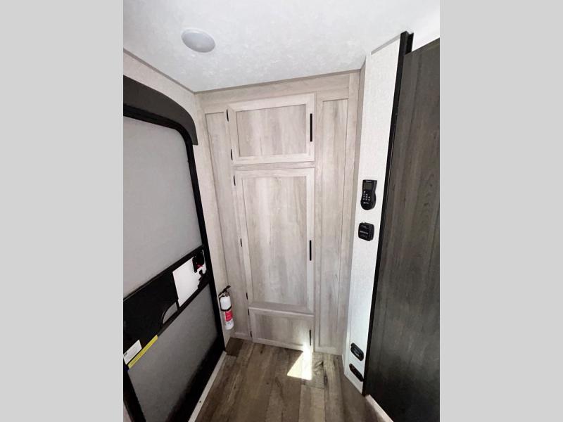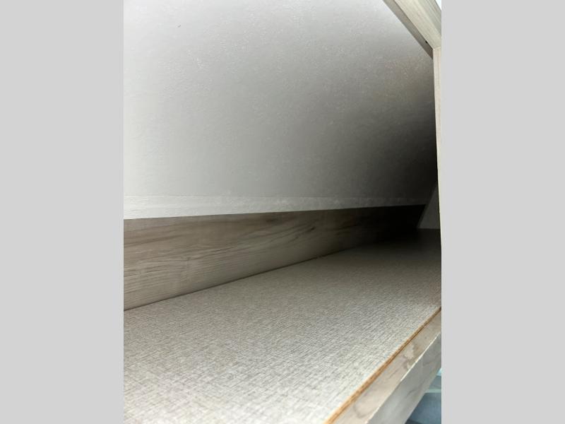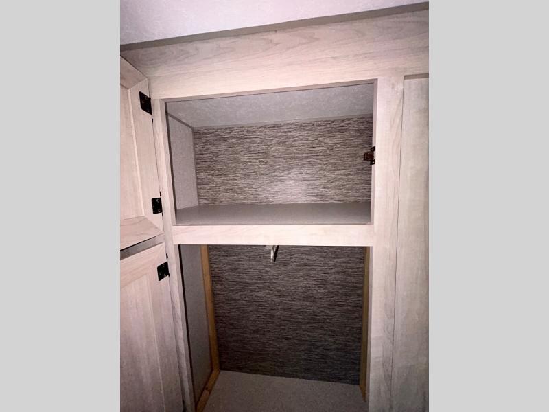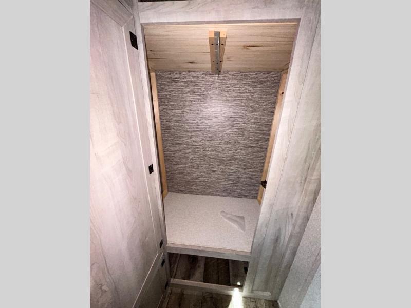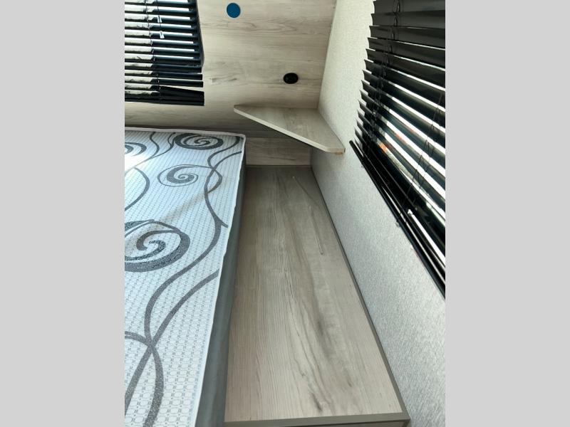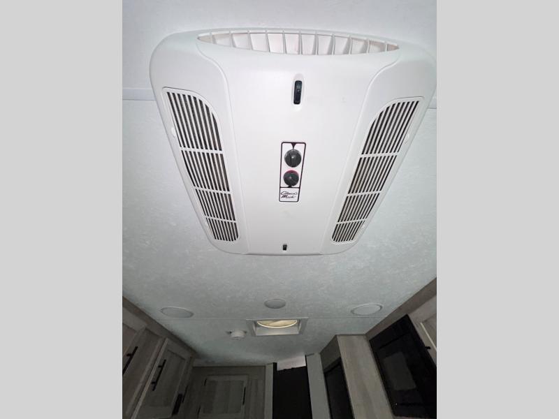 This travel trailer will feel just like home with its full bath, walk-around queen bed, and plenty of storage space for your belongings. Once you arrive at the campground, grab your fishing poles from the pass-through storage and head down to the river. You can get cleaned up in the full bath before heading to the kitchen to prepare a meal on the two burner cooktop or in the microwave oven. There is a comfortable booth dinette to dine at, and this space can double as sleeping space for overnight guests or two little ones.