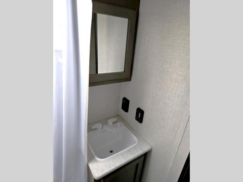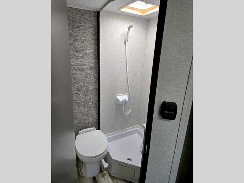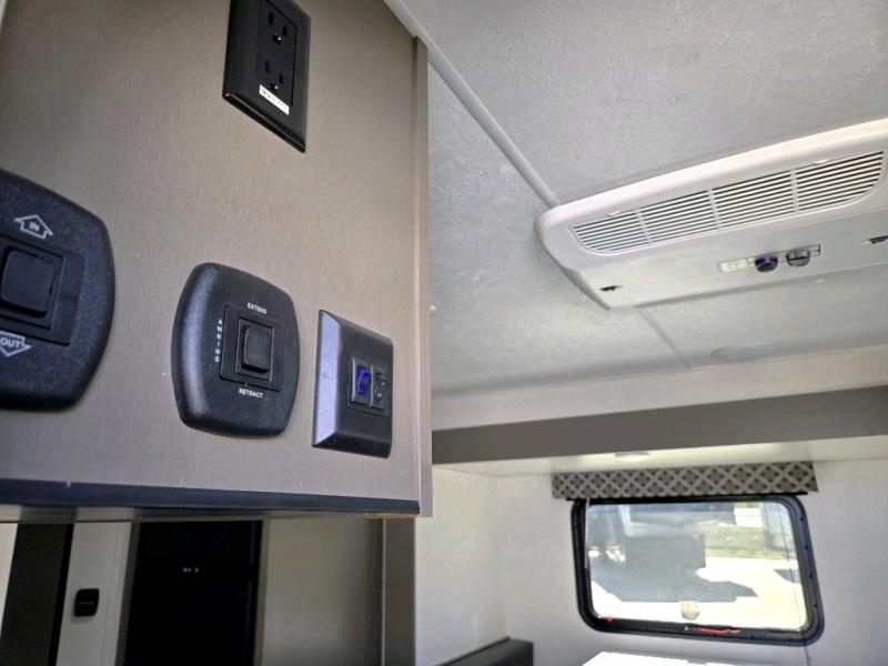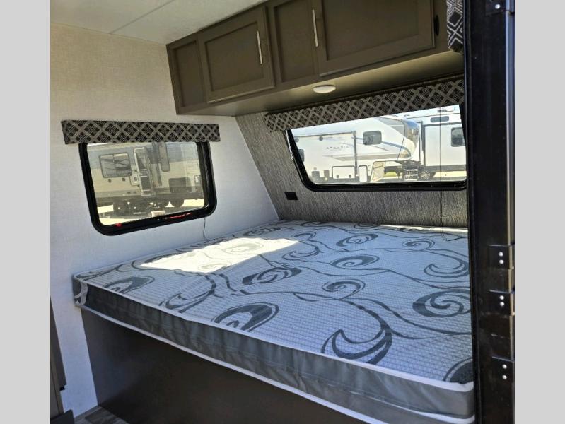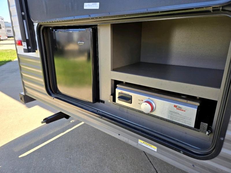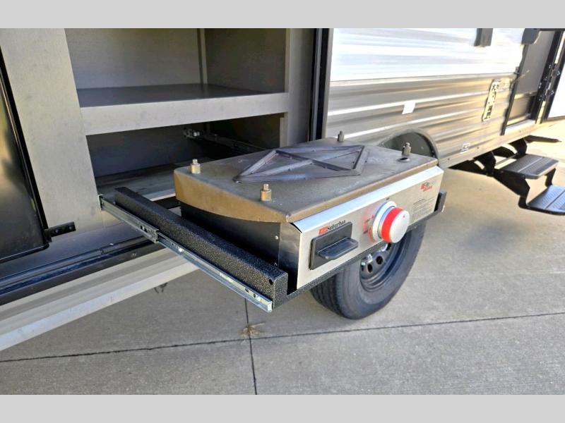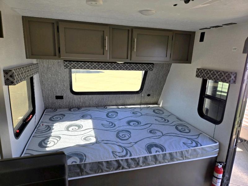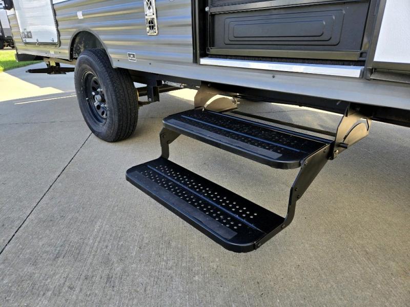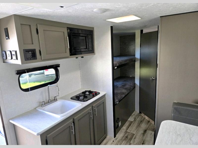 You're going to love camping in this spacious travel trailer that can sleep five people each night. When you arrive at your destination, set up the 14' power awning and start lunch on the outside kitchen. The little ones will love the bunk beds, and you will have the front RV queen bed all to yourselves. This model also includes a full bath that will allow you to stay clean!