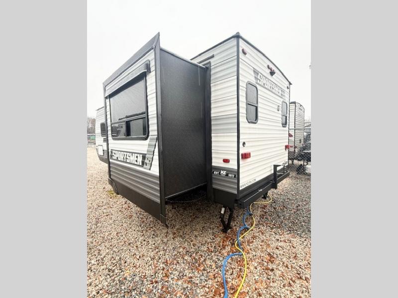 The perfect couples coach in this Sportsmen SE trailer with a queen bed up front for a great night's rest including wardrobe storage on both sides of the bed to keep your clothing wrinkle free. The complete kitchen and bath features everything you need to create meals on the go and stay clean and refreshed as well. The rear of the unit features a booth dinette slide for added floor space to move around. This is great for dining or playing a game of cards. Opposite the room an L-shaped sofa with pull-out ottomans for comfort as you kick back and relax for the evening with a good book, or add the optional 39" TV and enjoy! Outside, you can easily create more living space thanks to the 18' awning, and there is a nice pass-through storage compartment for all of your outdoor camping gear and equipment like camp chairs, bean bag toss, fishing rods and more.