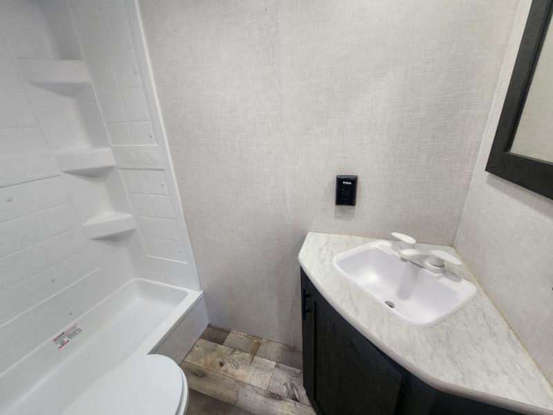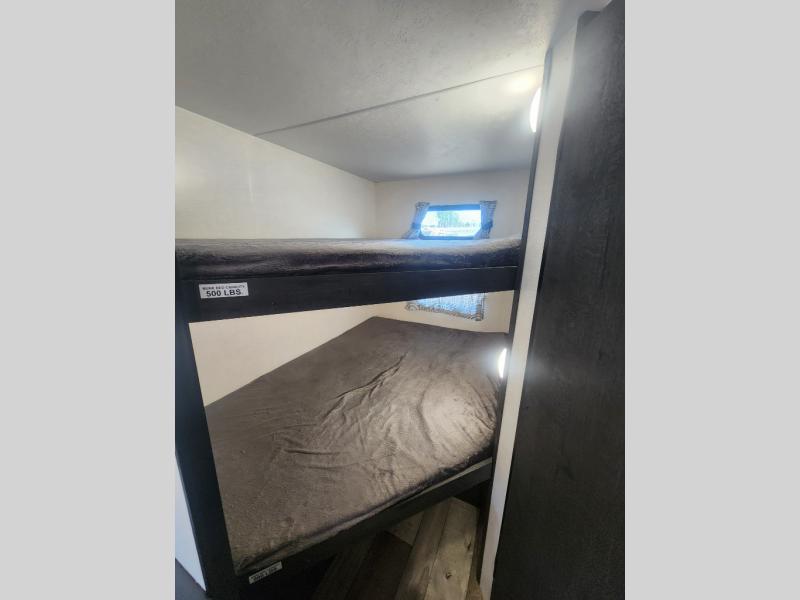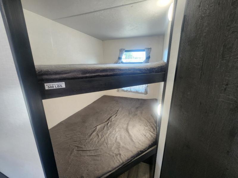 You can comfortably sleep eight people each night in this travel trailer, so invite your whole crew along! The little ones will love the double-size bunks, and the full bath is close by for convenience. You and your spouse can take the front private bedroom that includes a queen bed and dual shirt closets, and any other guests can sleep on the sofa or booth dinette. Prepare a hearty breakfast on the three burner cooktop each morning, and the sink covers will provide you with more counter space to cut up fresh fruit! This model includes plenty of storage space, including an exterior storage door plus a pass-through storage for fishing poles and tackle boxes!