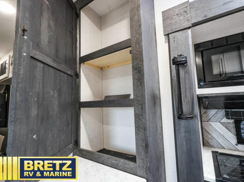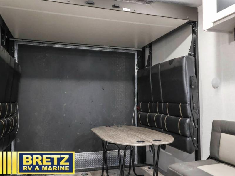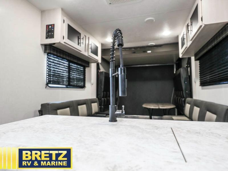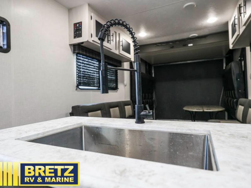 Sleep like a king, and ride your toys like you are a professional! This trailer offers a front master suite with a walk-around king bed, dual wardrobes and the second entry into this trailer. You will have access to the double entry bathroom as well. Everyone can stay clean with a radius shower in the full bathroom, and fed with the appliance slide out, and the counter peninsula offers the kitchen sink and a pantry. The main living area is created once you have unloaded your toys from 15' of garage space, and easily setup the two rollover sofas and tables. You might even like to add the optional power bed with Sit and Sleep which includes a bed ladder for more seating and sleeping space for family and friends. It's time to ride!