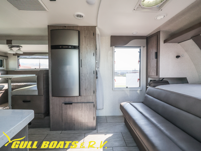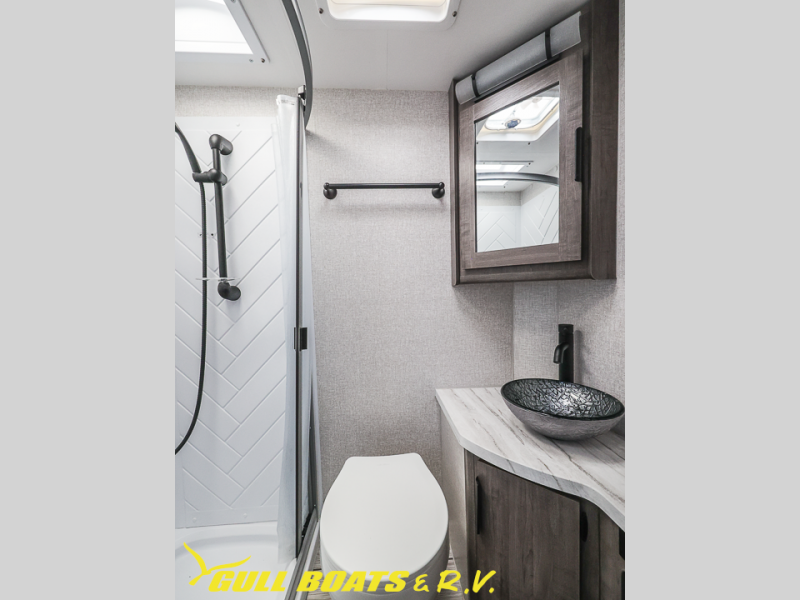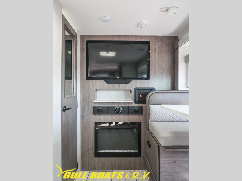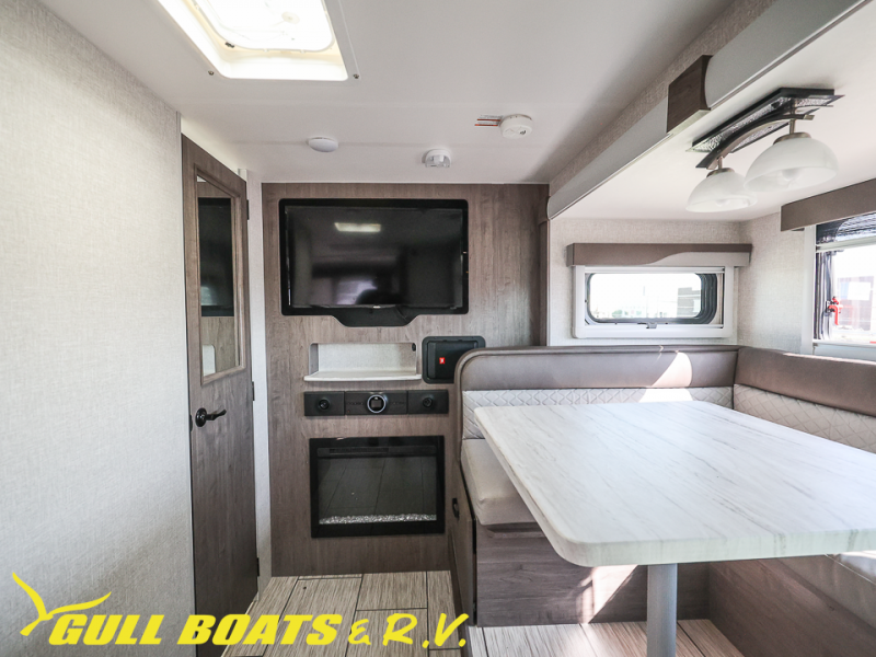 This travel trailer is the big brother to model 1575 with improved features! It has a larger bathroom with a beautiful residential vessel styled sink with high rise faucet, a 40" LCD Smart TV for your entertainment, and a functional front Murphy bed with a queen sofa to sit on during the day and a queen bed to lay on at night. You can prepare your best home cooked meals with the three burner range and 21" stainless steel oven then enjoy them at the large U-shaped dinette slide that has a residential glass lighting fixture with dimmer, plus you can transform it into a 46" x 78" bed for an extra sleeping space. There are also wardrobes to keep your clothes out of the way!