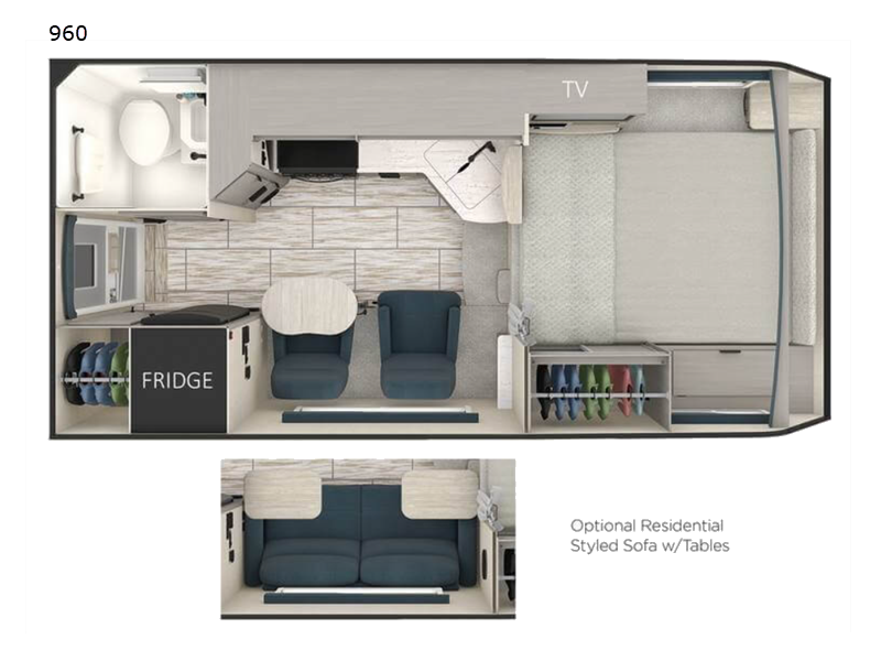 This truck camper combines the most desired must-have features with functionality! The front queen bed has a wardrobe next to it for your clothes, and places to set your electronics or a book, plus a privacy curtain to draw at night. Each swivel chair has a table in front for you to enjoy your meals at or you can switch them out for the optional residential-styled couch for a comfortable place to take a quick afternoon nap. Start and end your days feeling refreshed with the wet bathroom, and throw any unwanted trash into the hidden trash compartment.