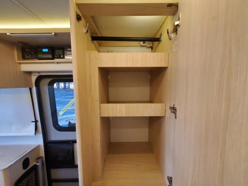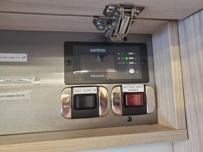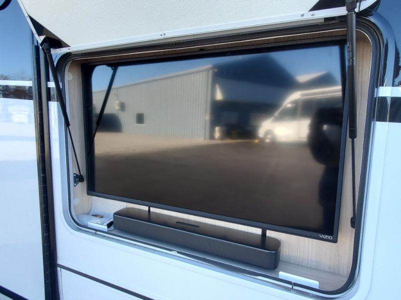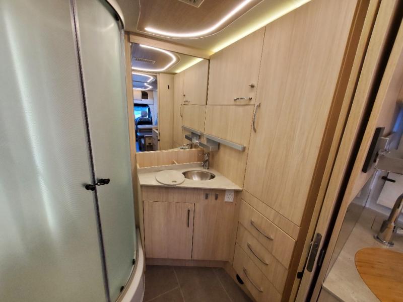 Traveling will be convenient and comfortable with this versatile Murphy bed/lounge slide unit at your fingertips. During the day once parked, you can easily seat four with the lounge chairs including a table between as well as having your driver and passenger seats swiveled around. This is a great place for hosting family or friends at your campsite or event. At night, the lounge seating is hidden as you flip-down the Murphy bed for a comfortable night's rest. In the morning, tuck it all away to bring back your living space. You will also enjoy the convenient kitchen amenities in place so you can easily whip up a meal or snack while you are stopped, and for overnight you can get refreshed for a new day in the rear bath featuring a radius shower with skylight, a sink, and closet space for your things.