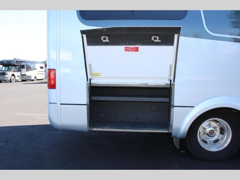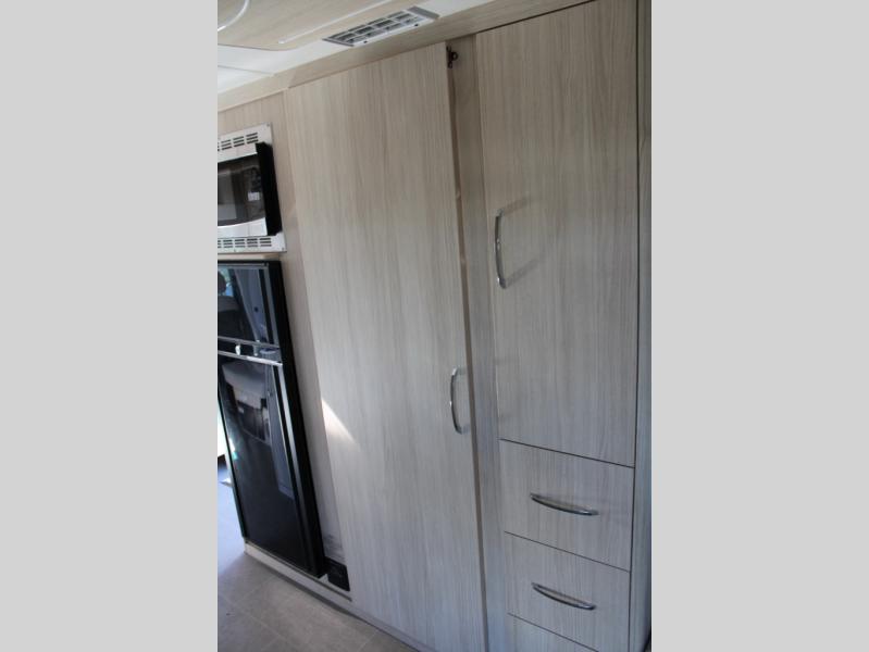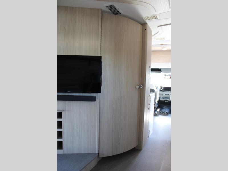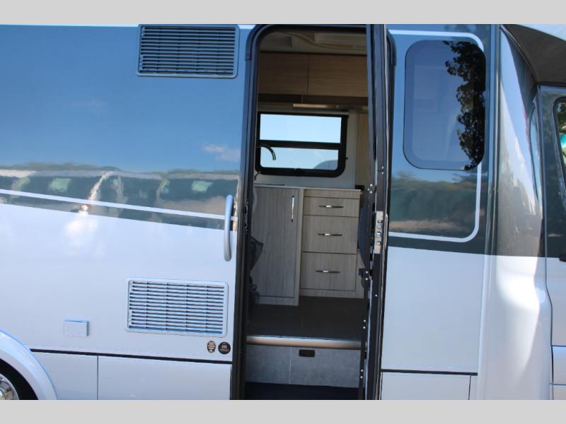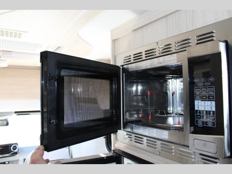 You will enjoy the two distinct living spaces with this Unity Class B+ diesel motorhome as you travel to all of your favorite locations. The dinette in front serves for dining and sleeping when converted into the optional front bed with the use of the front swivel captain's chairs for support. This is the perfect spot for when the grandchildren or guests come along. In back, you will find a comfortable lounge area with a 28" TV for inside entertainment plus a Murphy bed which easily converts the space into a bedroom that can be hidden away in the wall once morning arrives. The stainless steel convection microwave and the large pull-out pantry make it easy to create your delicious meals.
