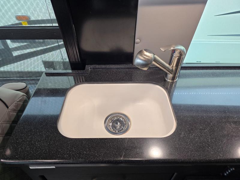 You will have lots of seating space on this Patriot Class B diesel motorhome! There is a rear power lounge that has three seat belts, so it can be used while traveling, and there are two sets of seats next to this sofa for more seating space. From this area, you can watch the rear HDTV or watch the optional front HDTV if you'd prefer! Make meals for the group, or keep it simple by preparing snacks in the microwave. A wet bath will keep you clean while you're out exploring, and you'll have lots of overhead cabinets to store your gear. The exterior height for this model is 9' 7" on the rear-wheel drive and 9' 11" on the 4x4.