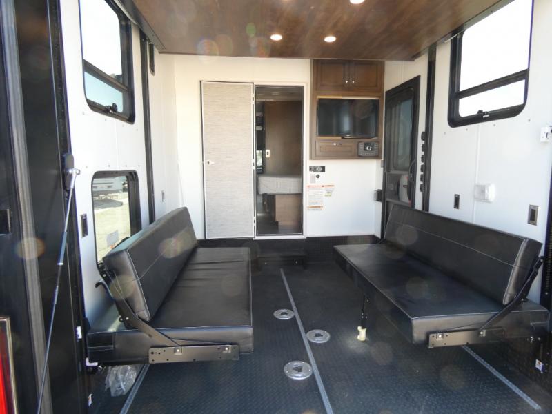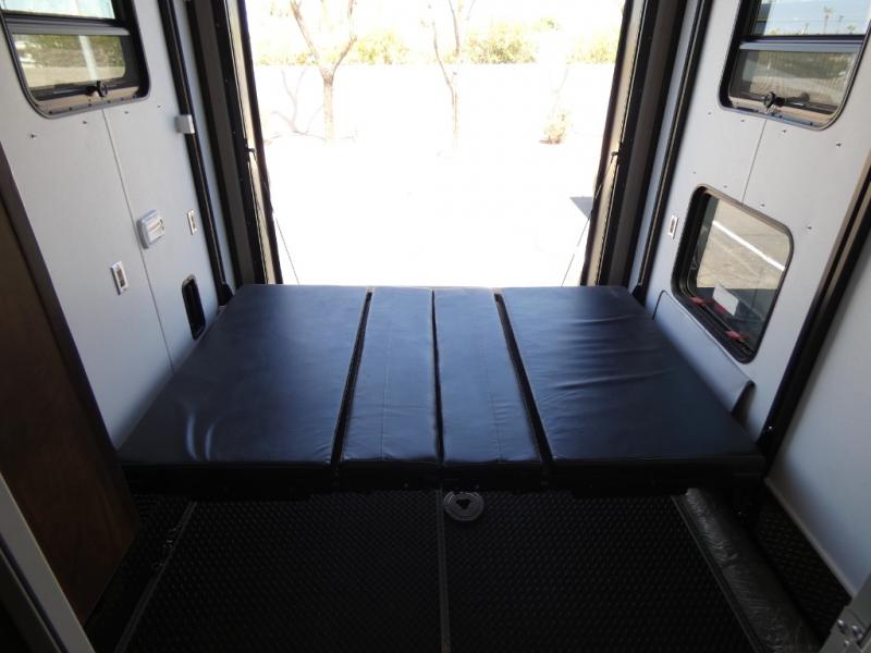The Newmar Canyon Star Class A diesel toy hauler has room for plenty of toys! The 10' garage with rear ramp access is designed for ATV & normal clearance motorcycles, and can also be accessed by a side entrance door. You can organize your toys with the tie-down tracks and you won't have to worry about scuffs with the diamond tread rubber flooring. The living area has a comfort lounge sofa and a booth dinette which can both be converted to sleep space. You'll sleep comfortably in the private bedroom which has a private bed, wardrobe with dresser, and an overhead console with a TV.