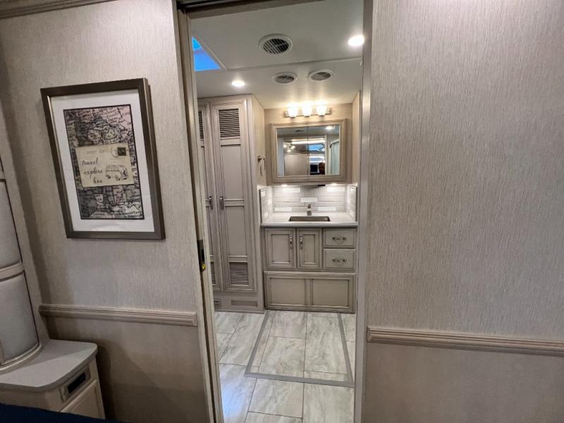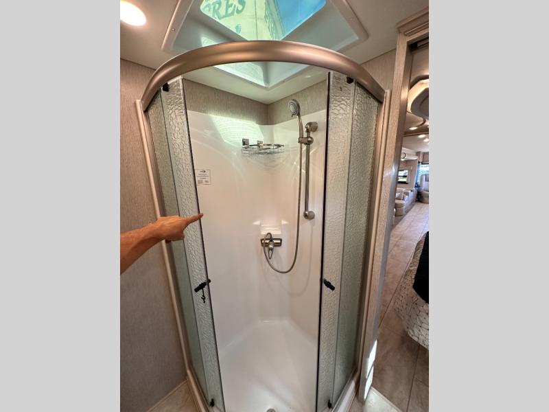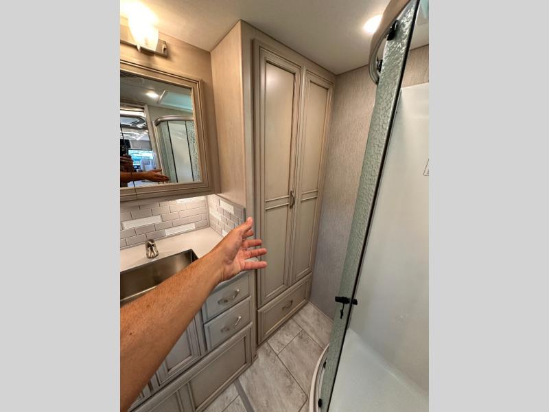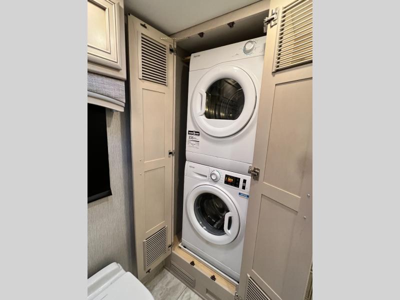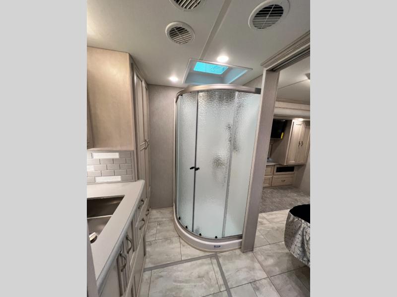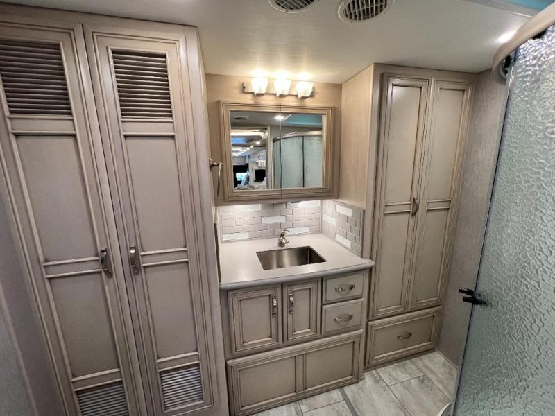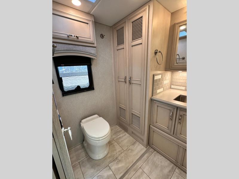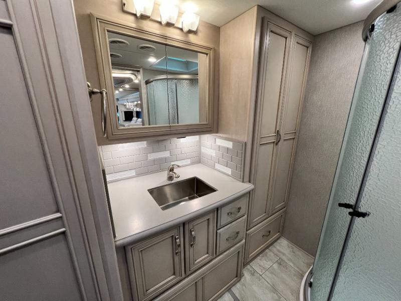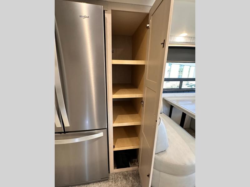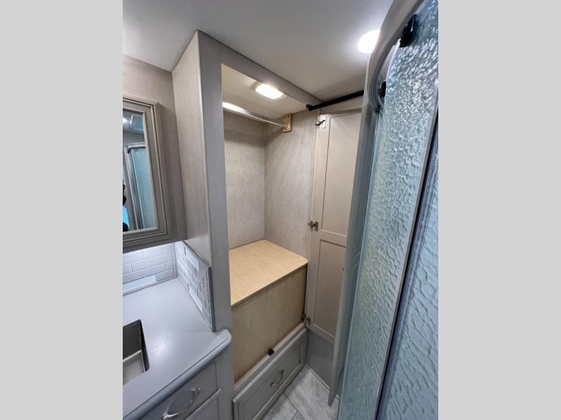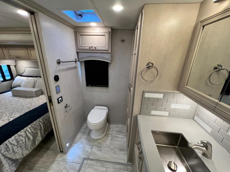 Everyone will enjoy having a bath and a half with this motorhome! The private bedroom not only has a king bed slide for a good night's rest and a dresser with wardrobes on either side and a LED TV, but also access to the full rear bathroom. Inside the bathroom is a 35" radius shower to freshen up each morning, a wardrobe with a bi-fold door for your towels, and an area prepped to add an optional washer and dryer. The half bathroom is conveniently next to the kitchen so you can get back to cooking on the three burner gas cooktop. The 10 cu. ft. Norcold refrigerator and pantry are right next to the booth dinette sleeper so you can easily grab your favorite drink and snack without missing your turn for card games!