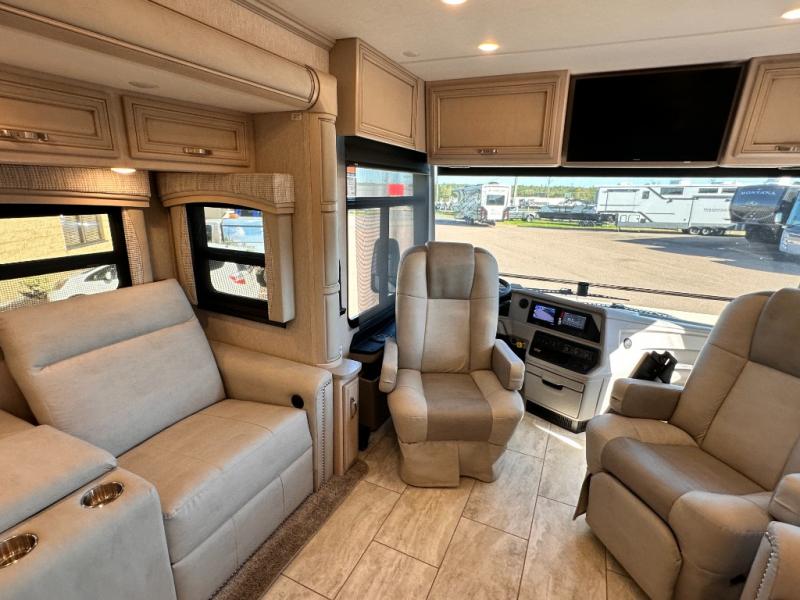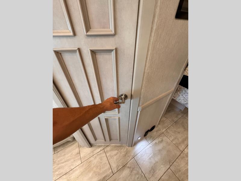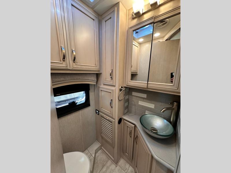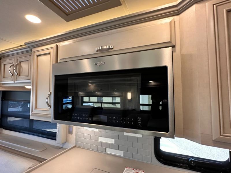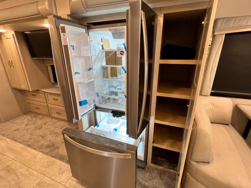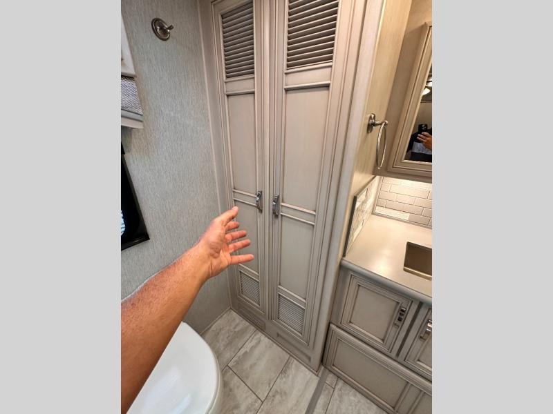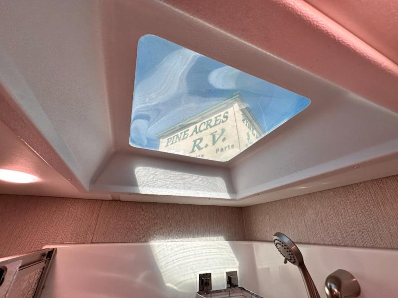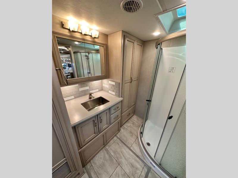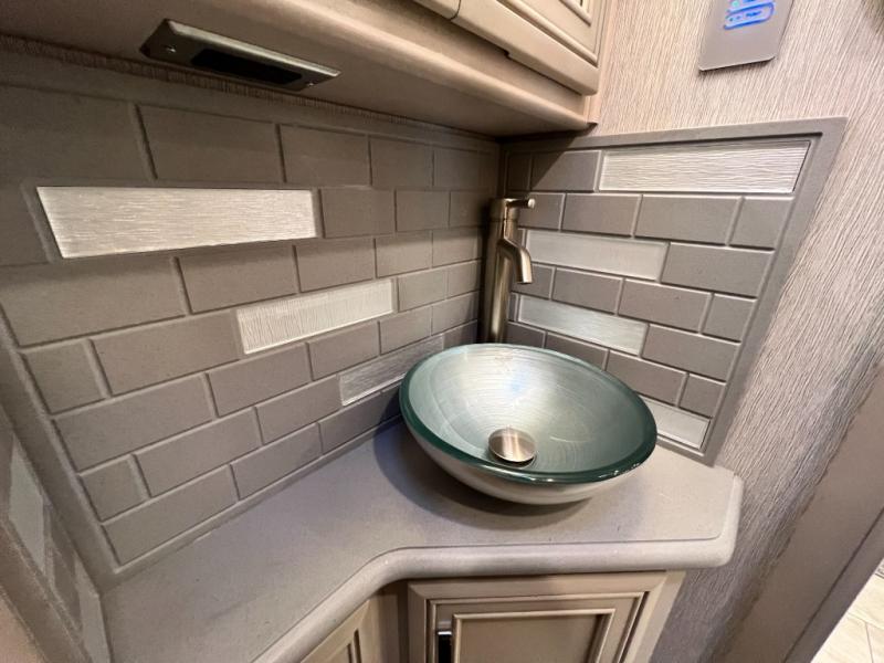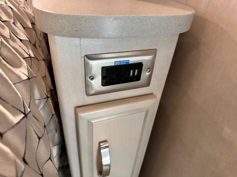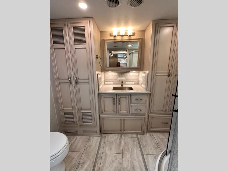 Everyone will enjoy having a bath and a half with this motorhome! The private bedroom not only has a king bed slide for a good night's rest and a dresser with wardrobes on either side and a LED TV, but also access to the full rear bathroom. Inside the bathroom is a 35" radius shower to freshen up each morning, a wardrobe with a bi-fold door for your towels, and an area prepped to add an optional washer and dryer. The half bathroom is conveniently next to the kitchen so you can get back to cooking on the three burner gas cooktop. The 10 cu. ft. Norcold refrigerator and pantry are right next to the booth dinette sleeper so you can easily grab your favorite drink and snack without missing your turn for card games!