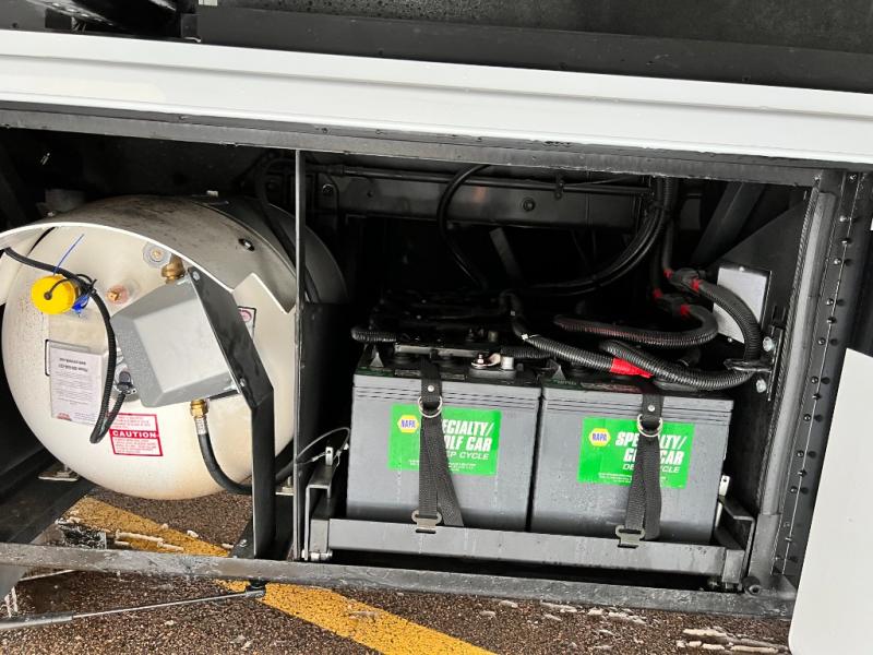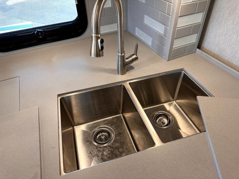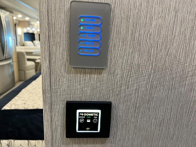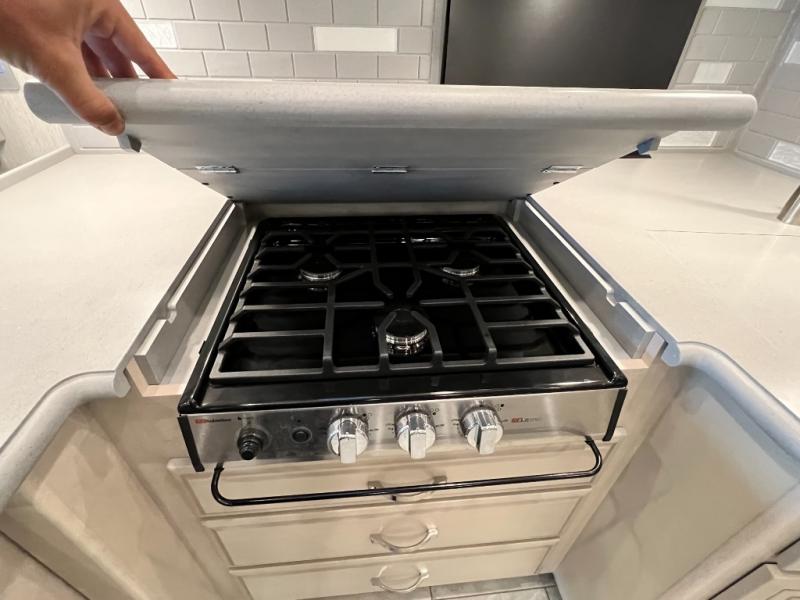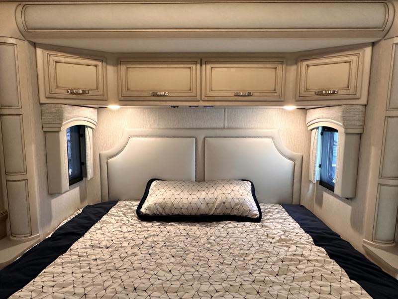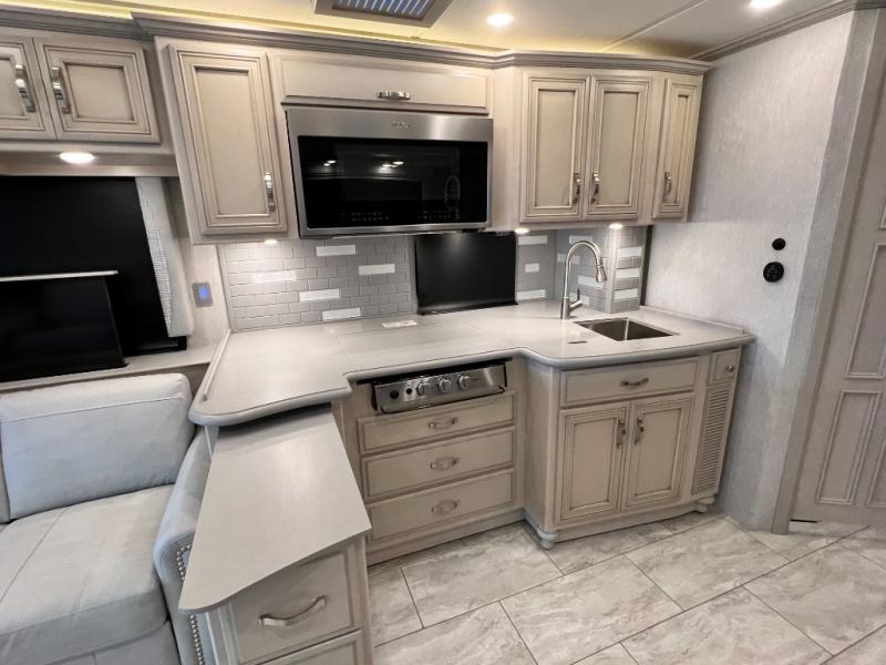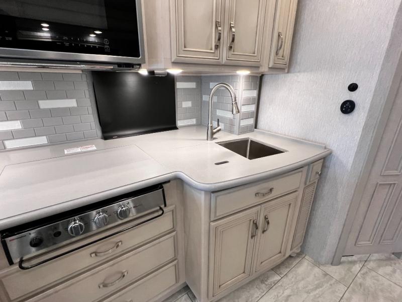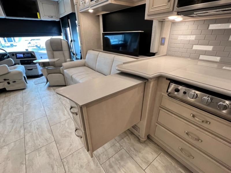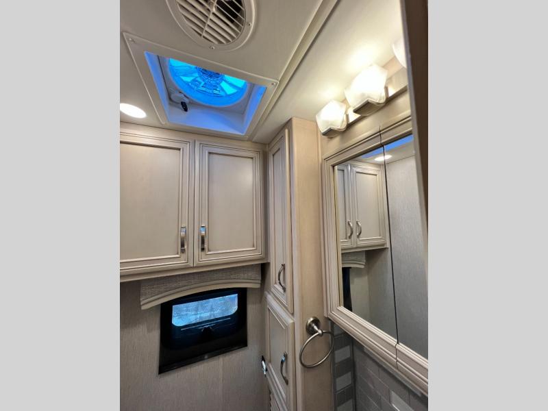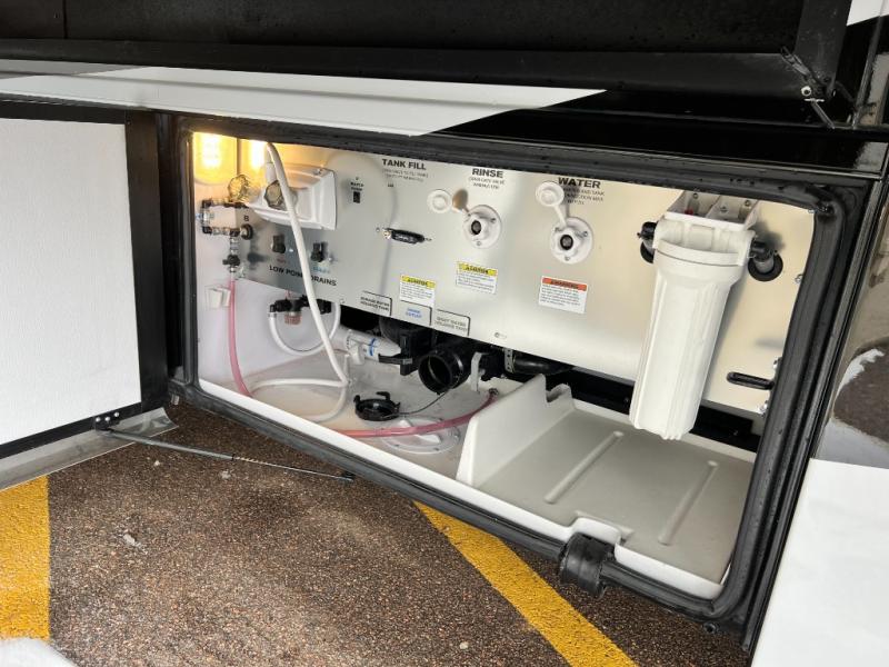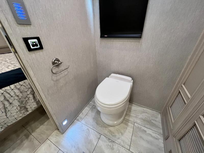 Everyone will enjoy having a bath and a half with this motorhome! The private bedroom not only has a king bed slide for a good night's rest and a dresser with wardrobes on either side and a LED TV, but also access to the full rear bathroom. Inside the bathroom is a 35" radius shower to freshen up each morning, a wardrobe with a bi-fold door for your towels, and an area prepped to add an optional washer and dryer. The half bathroom is conveniently next to the kitchen so you can get back to cooking on the three burner gas cooktop. The 10 cu. ft. Norcold refrigerator and pantry are right next to the booth dinette sleeper so you can easily grab your favorite drink and snack without missing your turn for card games!