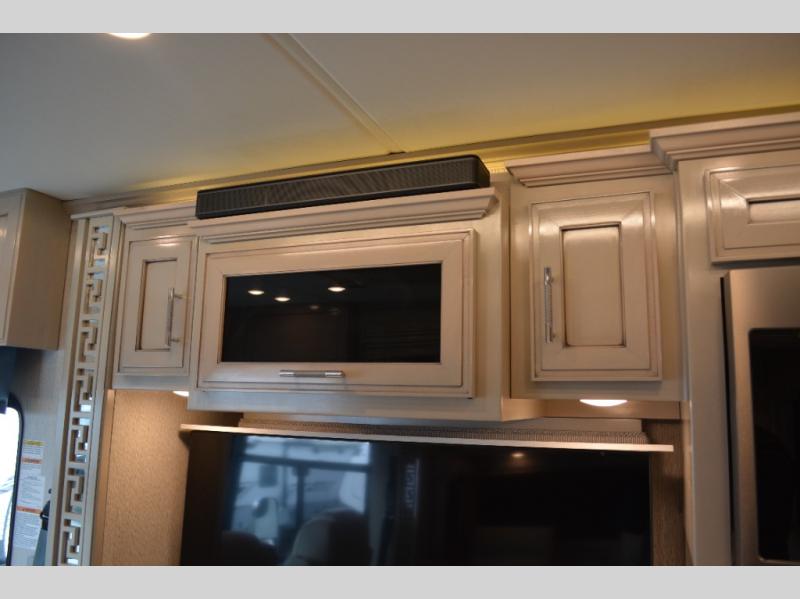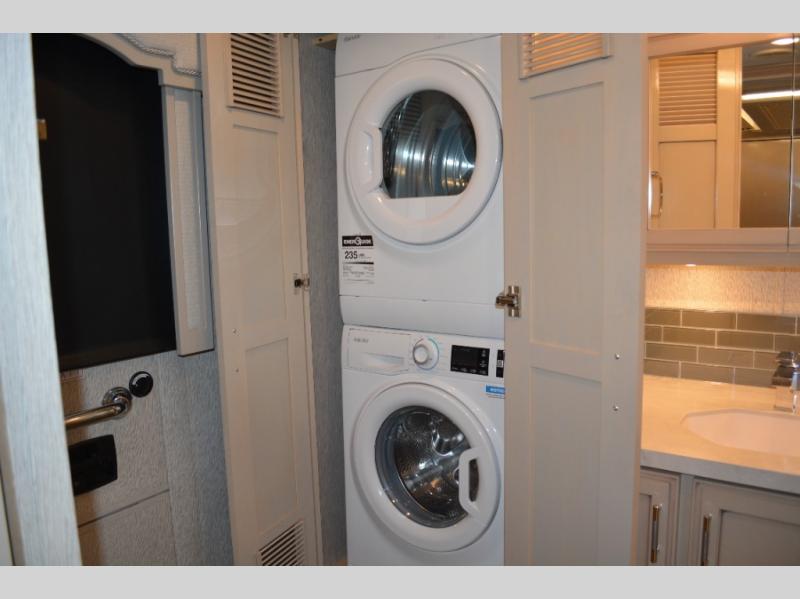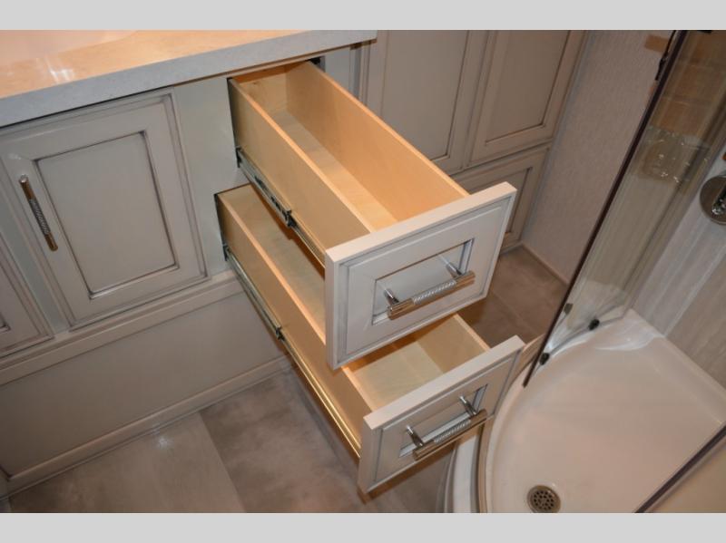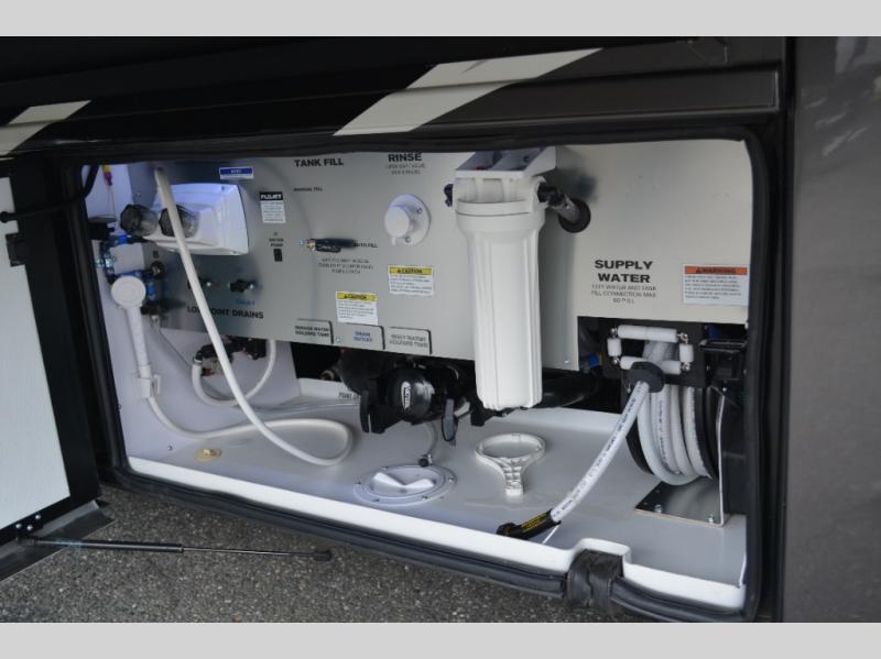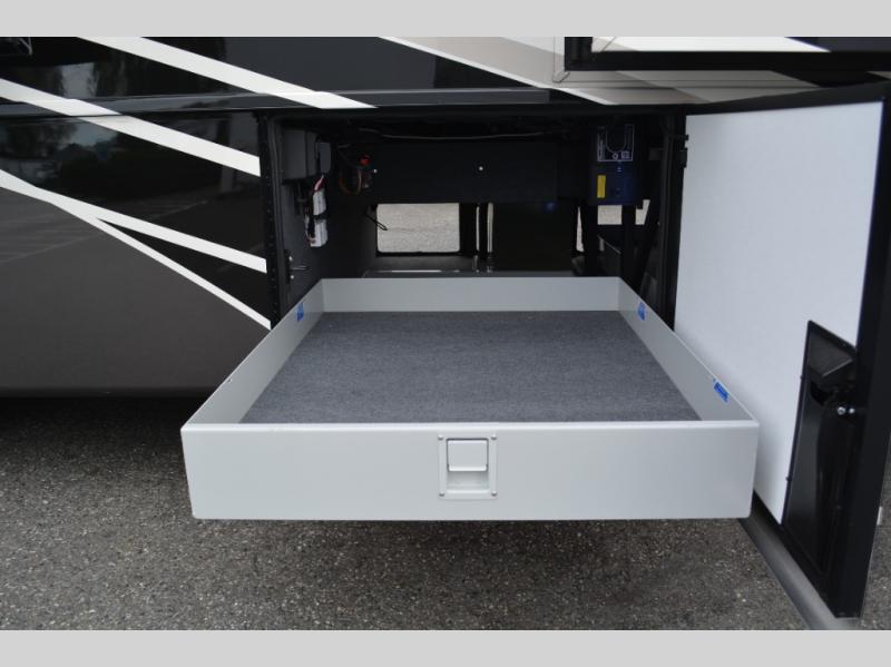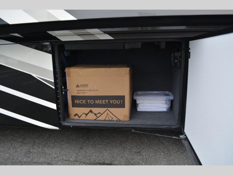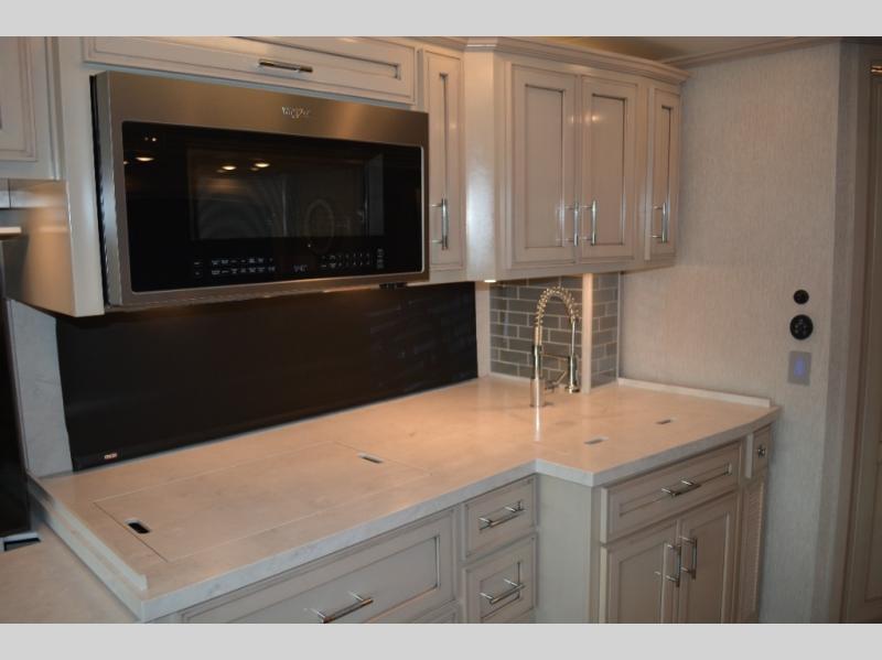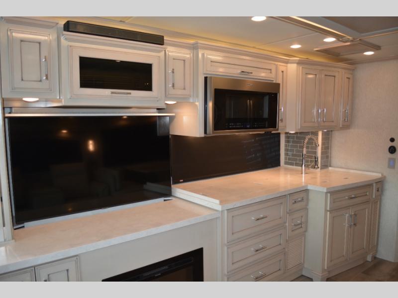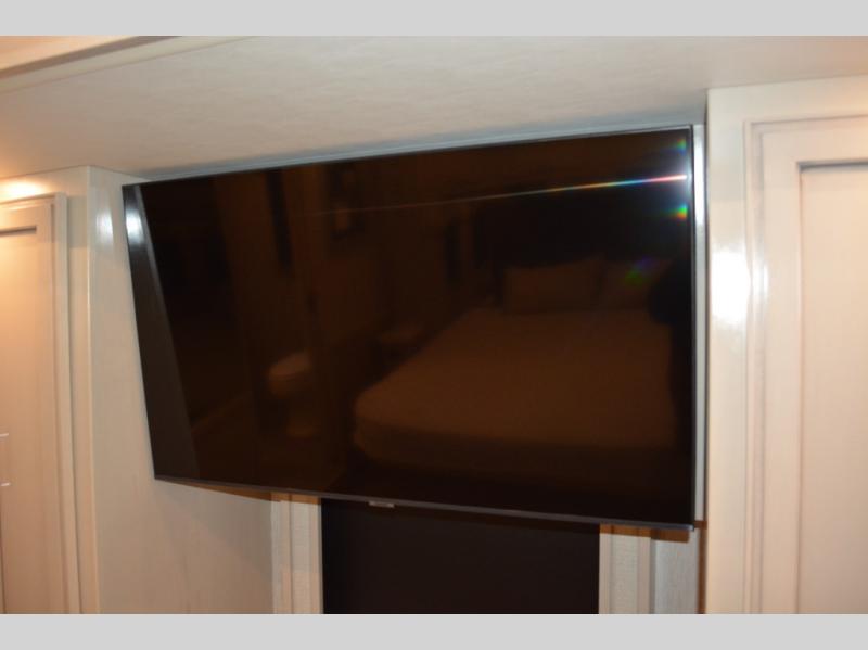 Life is more convenient with a bath and a half in this motorhome! The full rear bathroom has a 35" radius shower to freshen up in each morning, a wardrobe with a bi-fold door to keep your towels close by, and a second wardrobe that is prepped to add an optional washer and dryer, plus there is an emergency exit behind the toilet. You will enjoy a good night's rest on the king bed slide inside the private bedroom which also has wardrobes on either side of the dresser and a Samsung LED 4K TV. The fully-appointed kitchen has everything you will need to prepare delicious home cooked meals and enjoy them at the booth dinette (sleeper). What better way to wind down your nights than to relax on the 74" hide-a-bed sofa while watching a movie on the 50" Samsung LED TV on a power lift!