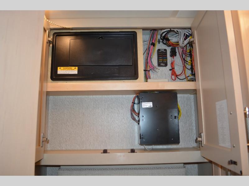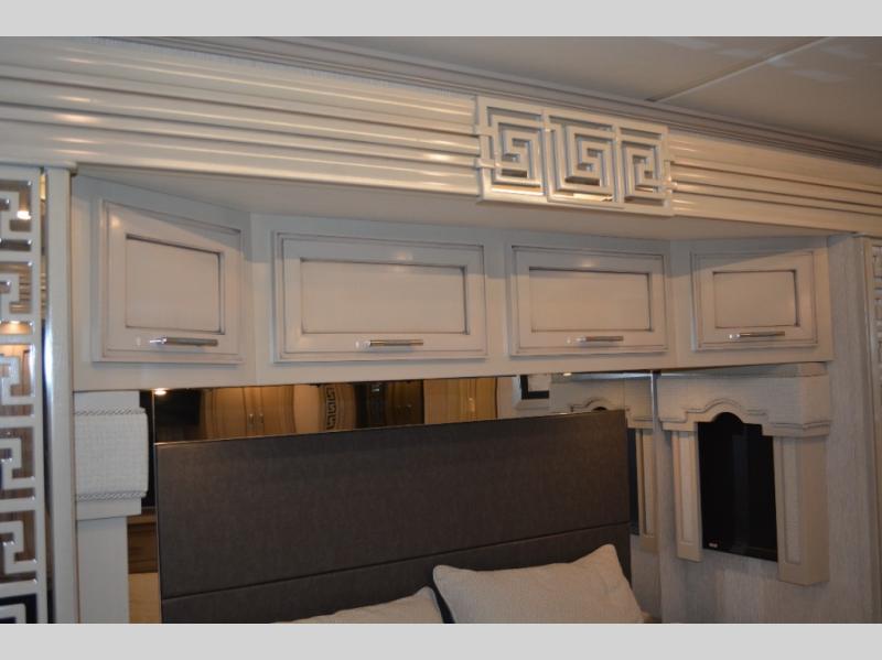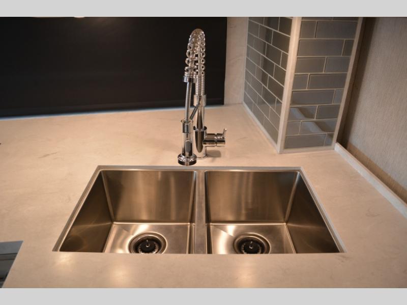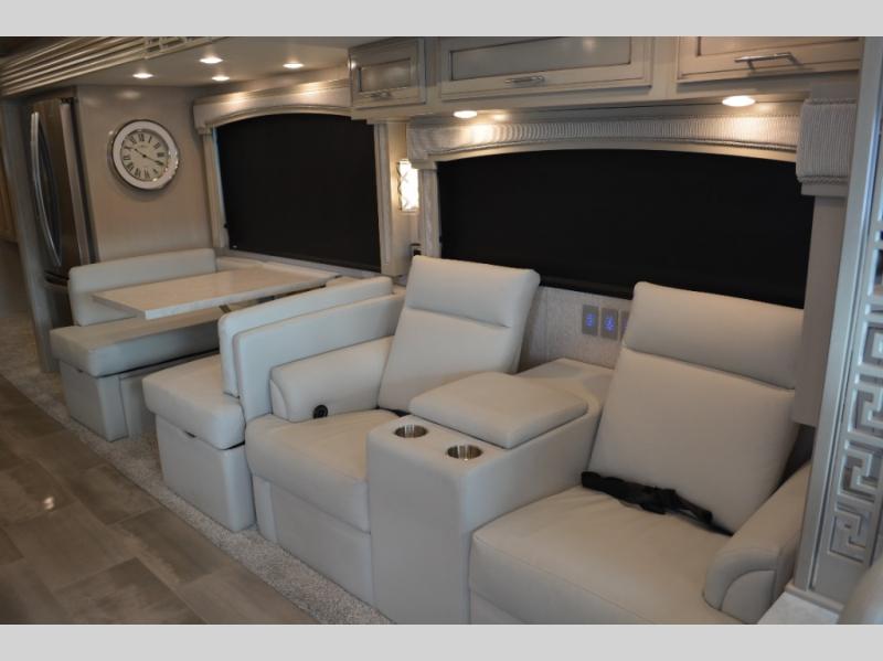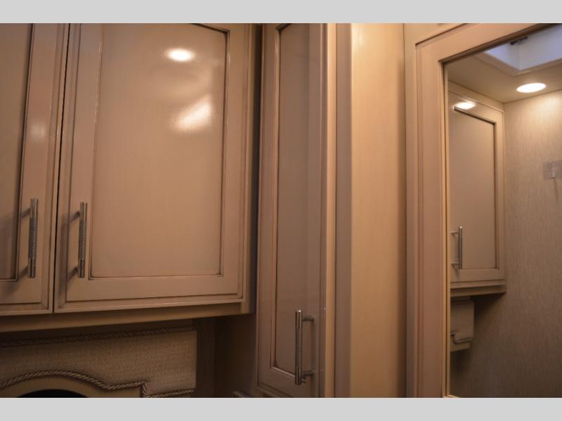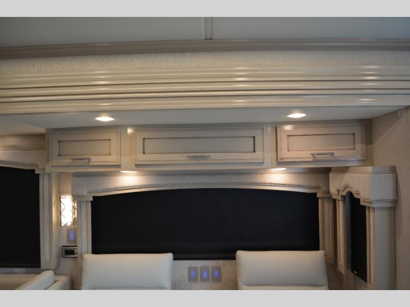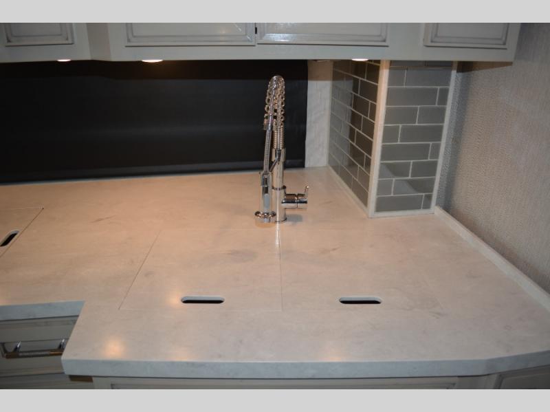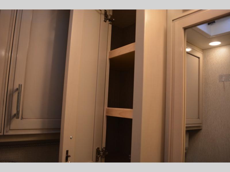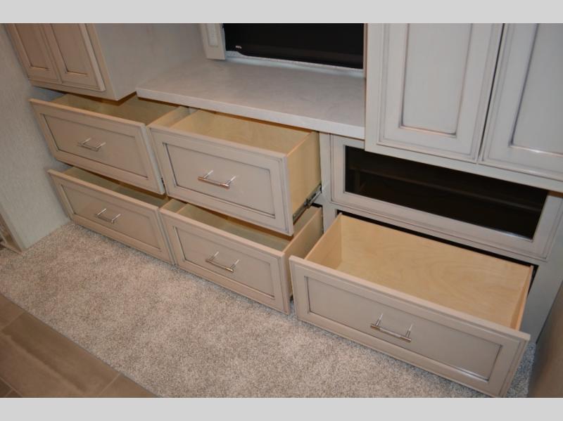 Life is more convenient with a bath and a half in this motorhome! The full rear bathroom has a 35" radius shower to freshen up in each morning, a wardrobe with a bi-fold door to keep your towels close by, and a second wardrobe that is prepped to add an optional washer and dryer, plus there is an emergency exit behind the toilet. You will enjoy a good night's rest on the king bed slide inside the private bedroom which also has wardrobes on either side of the dresser and a Samsung LED 4K TV. The fully-appointed kitchen has everything you will need to prepare delicious home cooked meals and enjoy them at the booth dinette (sleeper). What better way to wind down your nights than to relax on the 74" hide-a-bed sofa while watching a movie on the 50" Samsung LED TV on a power lift!
