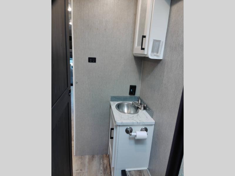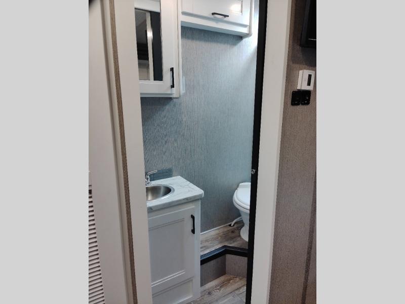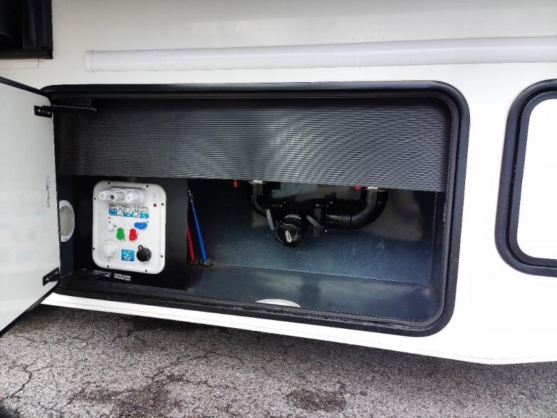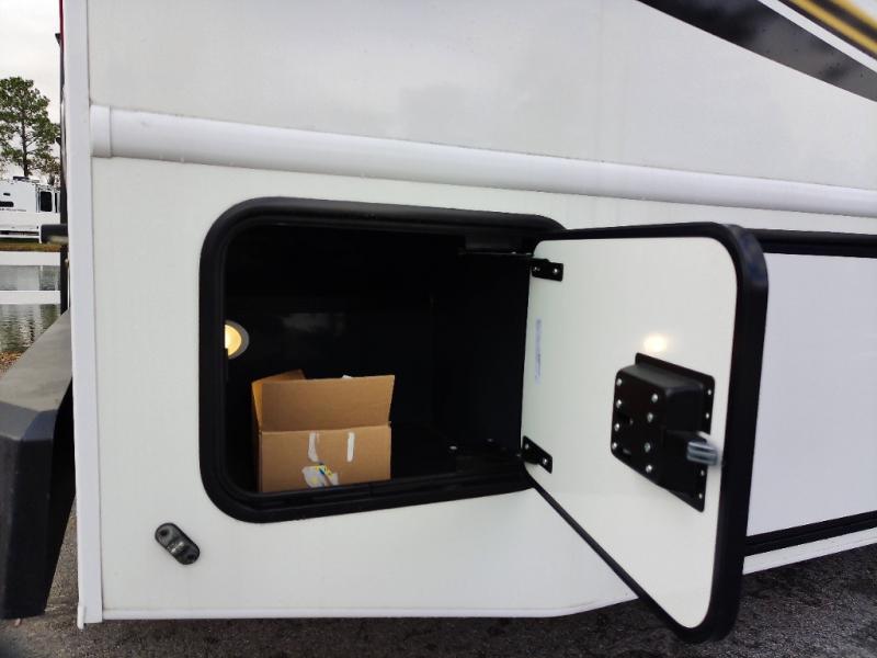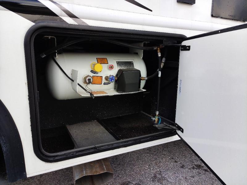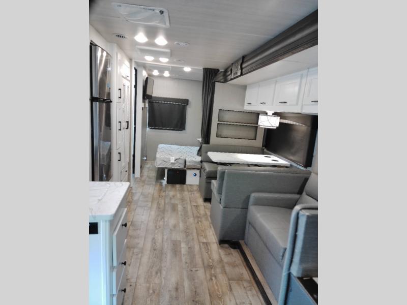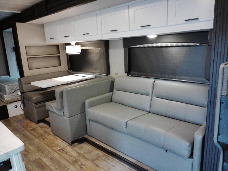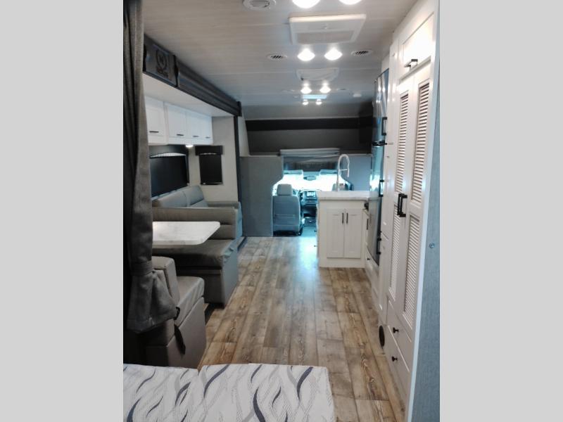 This Super C motorhome provides efficient living space and plenty of room for fun! With a full-wall slide running the length of the coach, each area has lots of space. The bedroom area in the rear features a folding queen bed with deluxe innerspring mattress. The adjacent bath is accessed via a sliding door to further maximize your space. The bath is well equipped with a 24” x 32” shower, toilet, sink, and medicine cabinet. The rear of the coach also offers plenty of storage with a linen closet as well as an area prepped for an optional washer/dryer combo. Up front, you’ll find a comfortable sofa and a nice kitchen with a 12V refrigerator, three-burner stove top, and over the range microwave with exhaust fan to keep things fresh and clean. The 22” x 42” dinette is yet another space to relax.