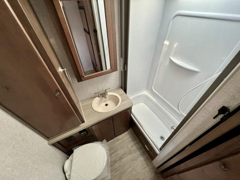 A family of three or four will love camping in this trailer with the versatile front roll over sofa and 60" x 74.5" Murphy bed, and the slide out with a U-shaped dinette and wardrobe. The dinette converts to 45" x 85" sleeping area for your child or smaller children at night making it versatile for your needs. You will find three wardrobes for your clothing, a pantry for your dry goods, and exterior storage for your outdoor gear. The full bathroom will keep you refreshed before bedtime, and the kitchen offers a residential microwave, a range and large fridge.