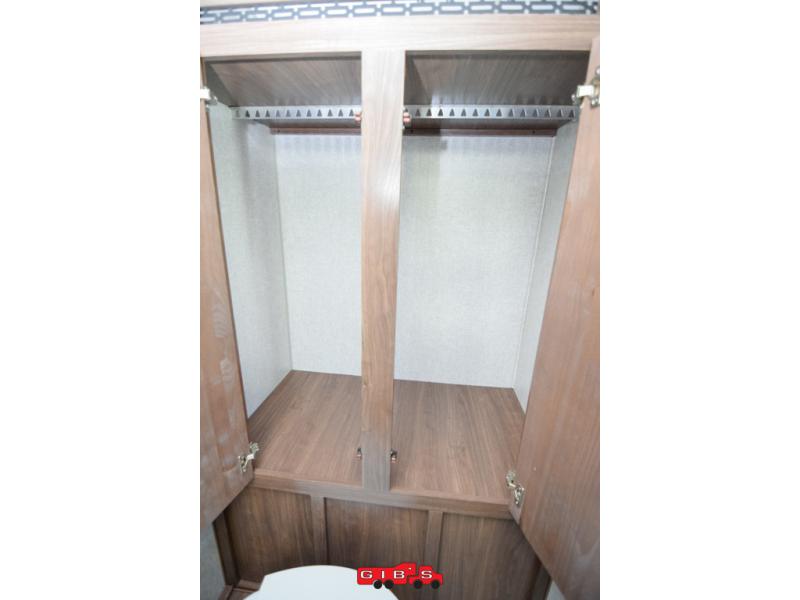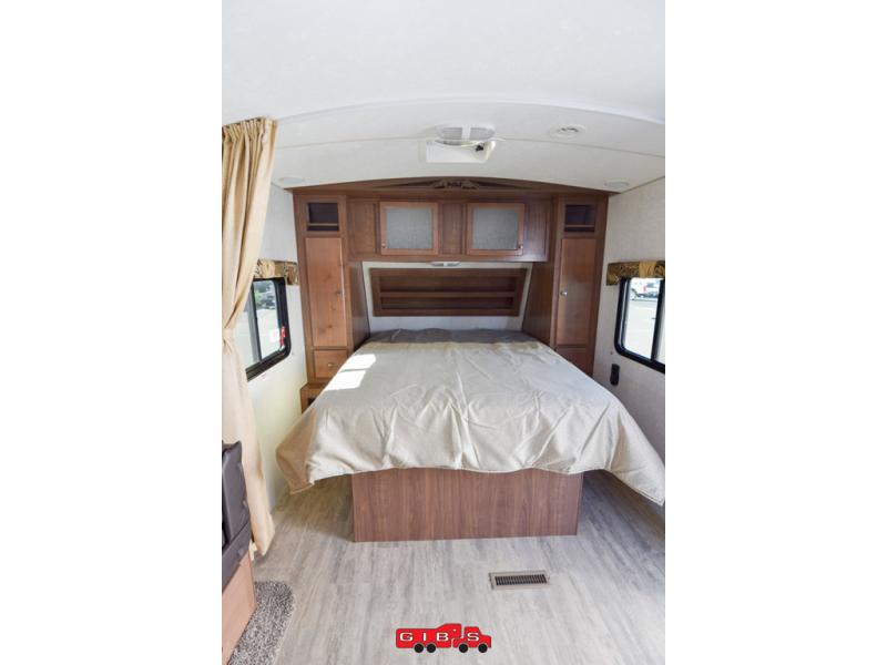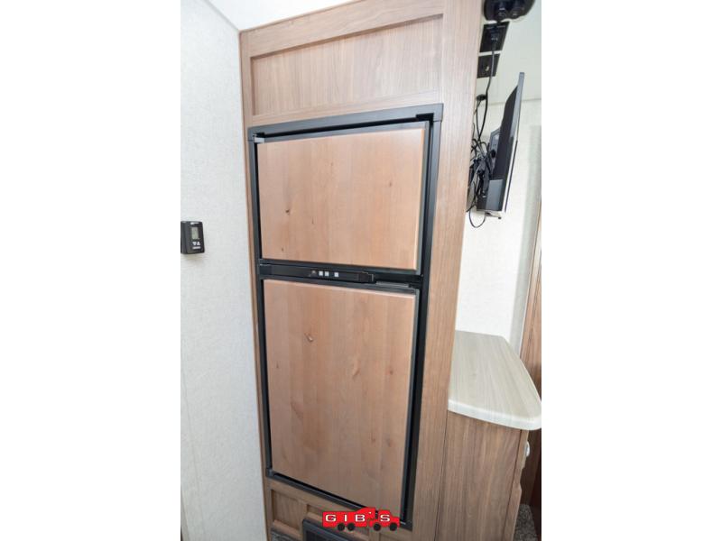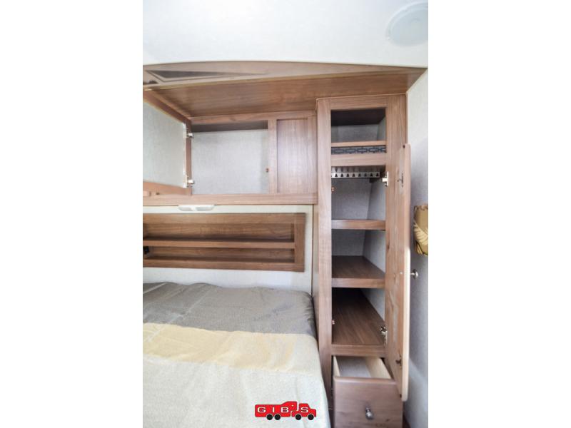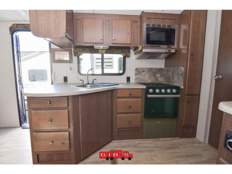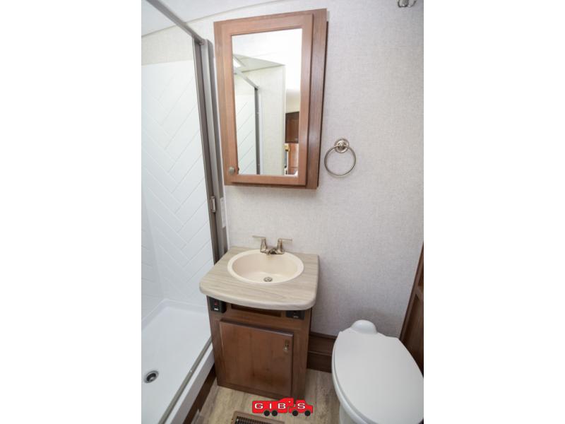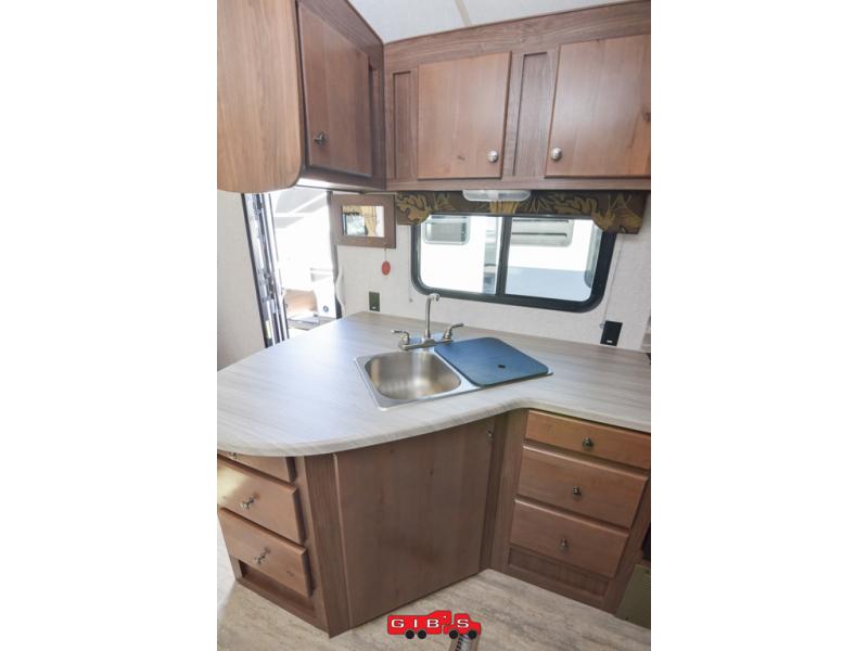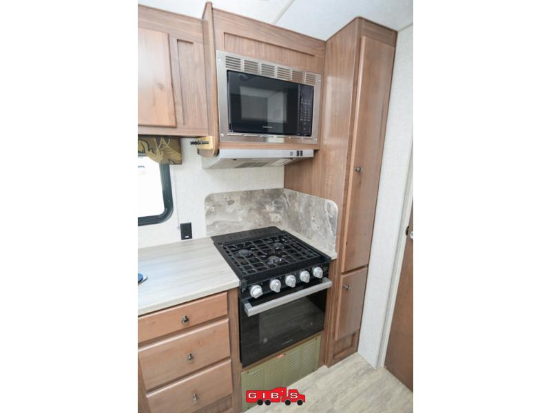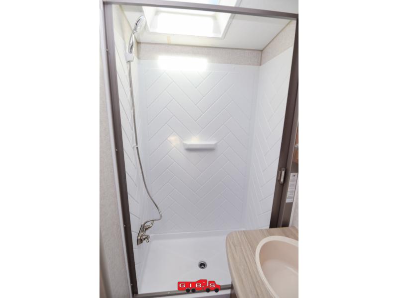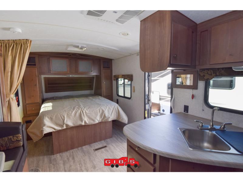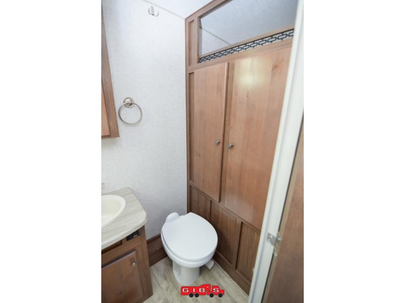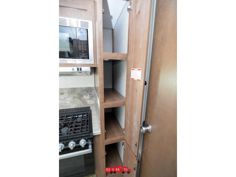 This is the perfect couple's trailer with space for an overnight guest or two on the U-shaped dinette slide. The kitchen also offers a pantry for dry goods and overhead storage for dishes and such as well as a 7 cu. ft. refrigerator to store your cold items. Outside you will enjoy features like the Carefree Travl'R 12V awning to protect you from the sun while you watch the kids play and the outdoor shower for them to rinse off before going inside.