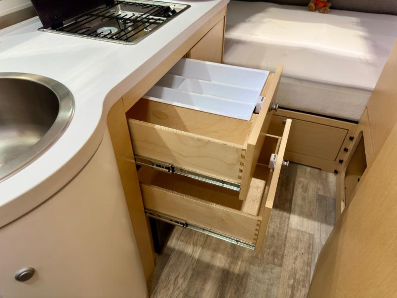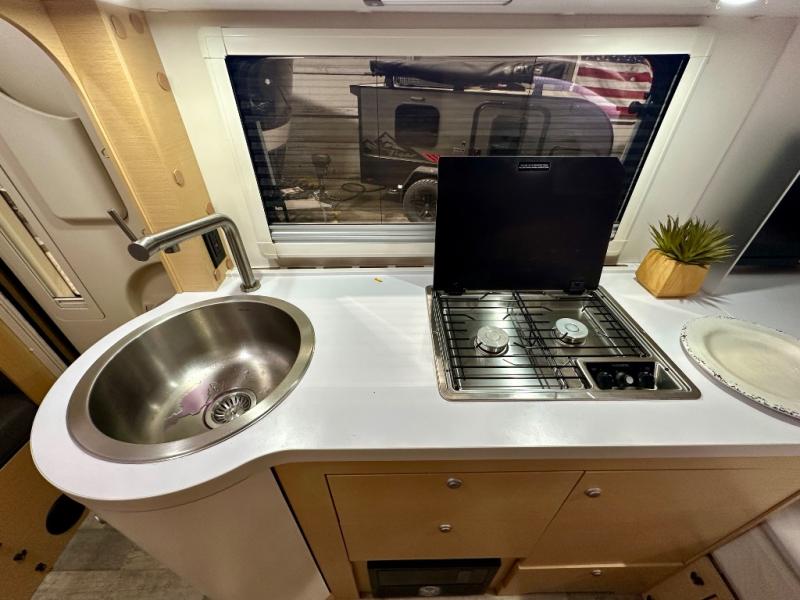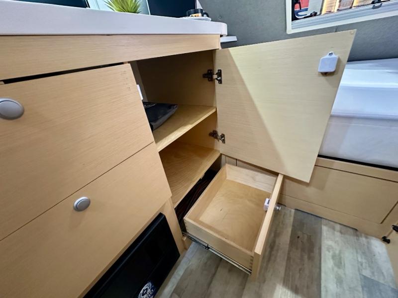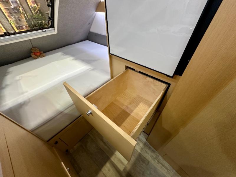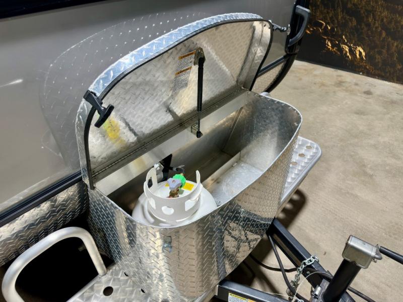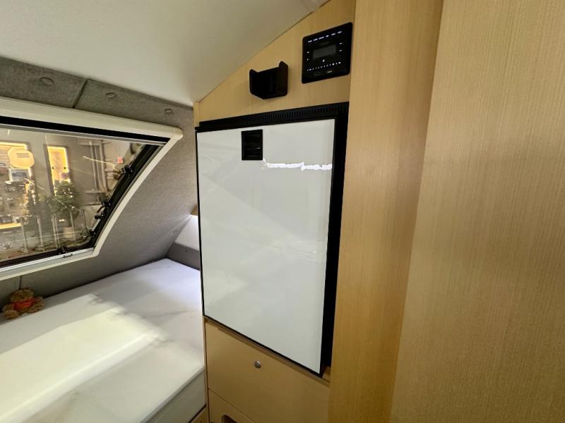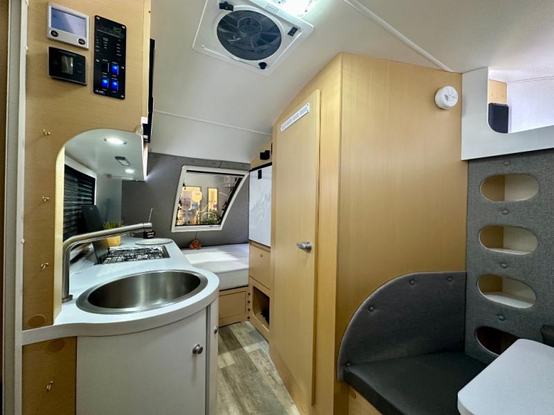 This teardrop trailer offers sleeping space for three with two sleeping areas; one up front and one in the rear. The dinette allows you to eat and relax during the day, and at night this space becomes sleeping space for one. The queen-size sleeping area is located on the opposite side with the wet bath in between for convenience for all. The galley kitchen will give the cook a place to make warm meals and store leftovers in the 4.6 cu. ft. fridge. Everyone can watch the 24" TV through the Bluetooth media center before bedtime, or in the morning as you all plan your next activity. And the Alde central heat and Alde FLOW instant hot water system as well as central air conditioning will keep you comfortable where ever you setup. If you enjoy more off-road type camping, consider the optional Boondock package and Lithium battery option which will allow you to go off-grid. The Lithium battery will provide 400-amp hrs. of lithium w/internal heat, Bluetooth connected SmartShunt and 3000-watt inverter/charger with Bluetooth control. Please note: The model specs. shown are for the standard TAB 400. With the Boondock optional package the height will be 8' 11", dry tongue weight will be 407 lbs. and total gross dry weight will be 2,919 lbs.