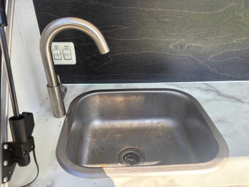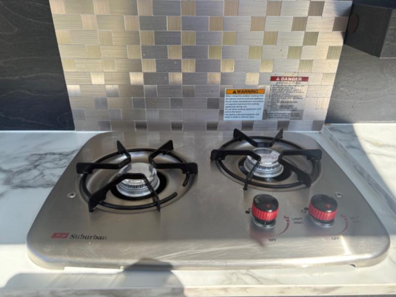 The rear hatch opens to reveal a well-equipped galley kitchen featuring a two-burner stove, stainless steel sink, YETI cooler or 12V fridge (varies by configuration), and solid-surface countertop. Cook breakfast with a view or prep dinner as the sun sets—it’s all part of the TAG experience.